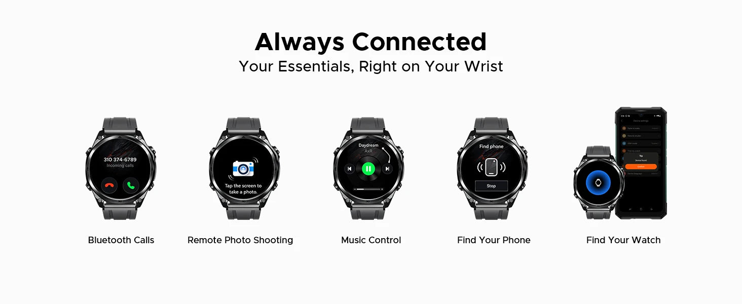 - Musiksteuerung & Kamera-Fernbedienung: Steuere Playback und schieße spontane Fotos, ohne dein Telefon zu holen.