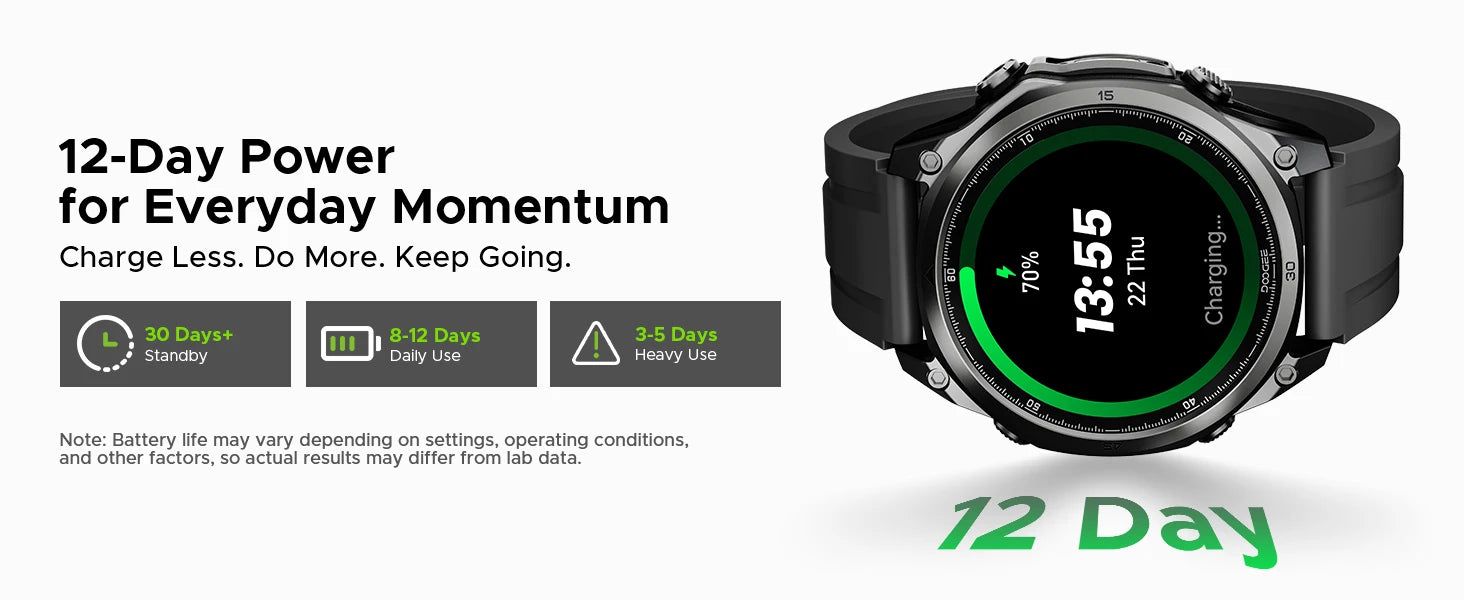 - Große Akku-Kapazität: 550 mAh für 8–12 Tage Nutzung je nach Aktivität – weniger Laden, mehr Freiheit.