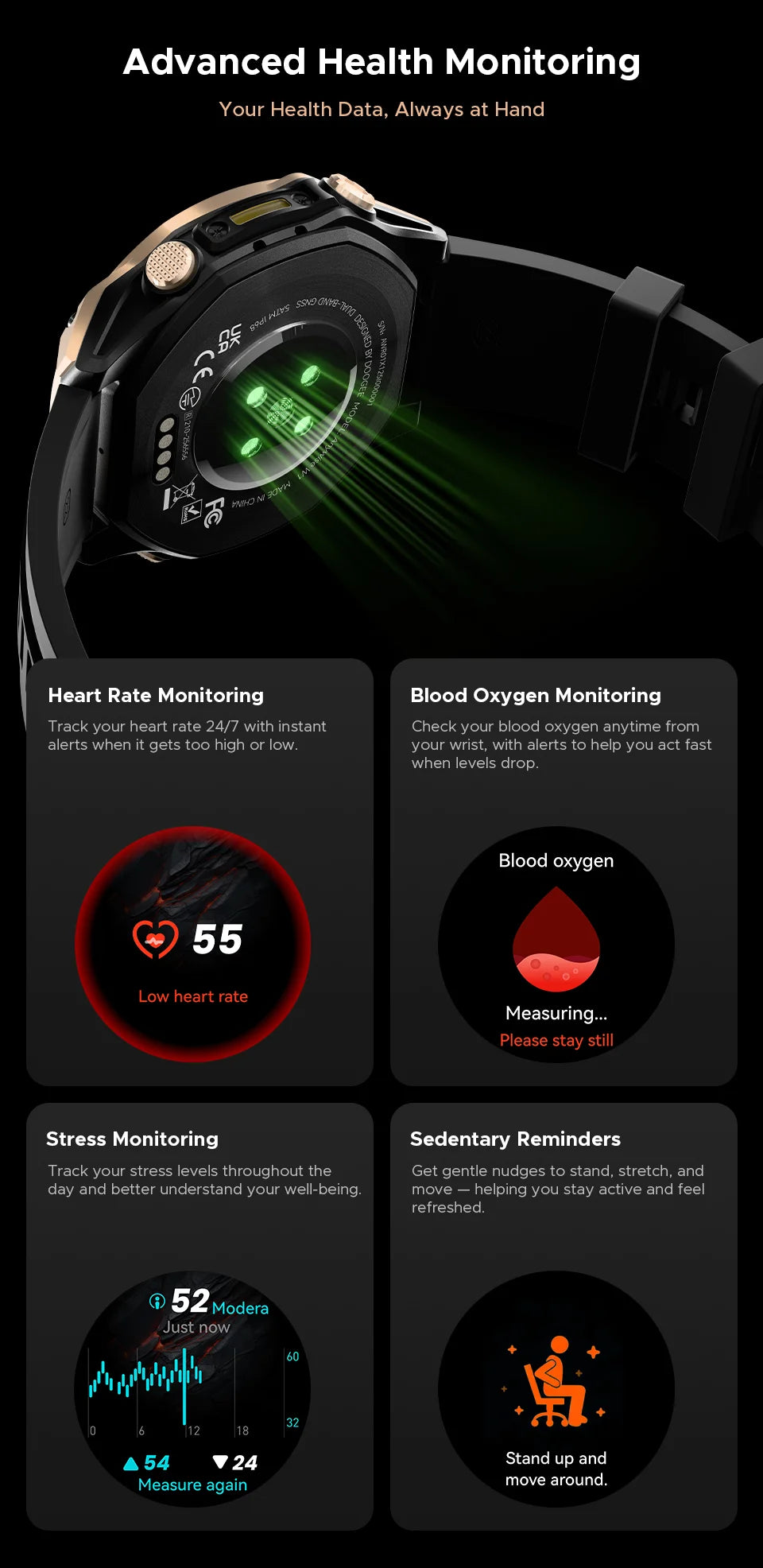- Problem: Unzureichendes Gesundheits-Tracking – Lösung: Herzfrequenz, SpO2 und Schlafanalyse liefern fundierte Einblicke in dein Wohlbefinden