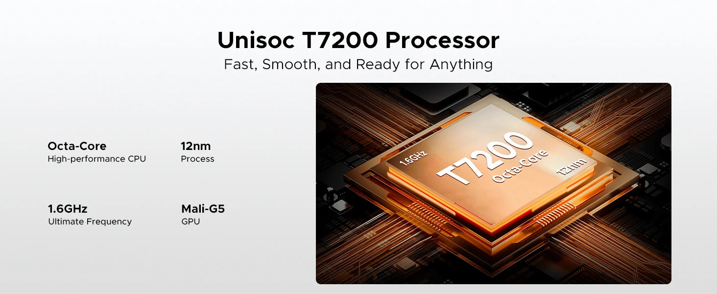 - Leistungsstarke UNISOC T7200 Octa-Core Plattform sorgt für effiziente Leistungsaufnahme
