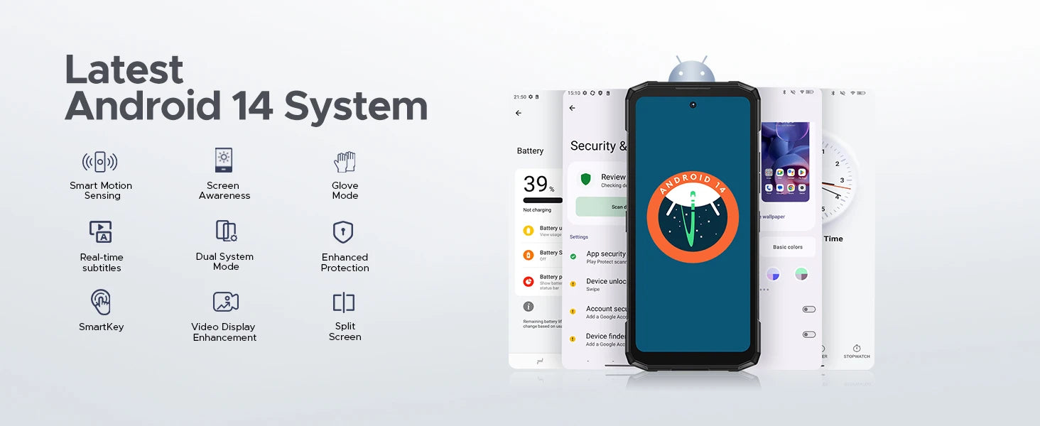 - Android 14 ermöglicht aktuelle Sicherheitsupdates, einfache Bedienung und moderne Funktionen direkt out of the box.