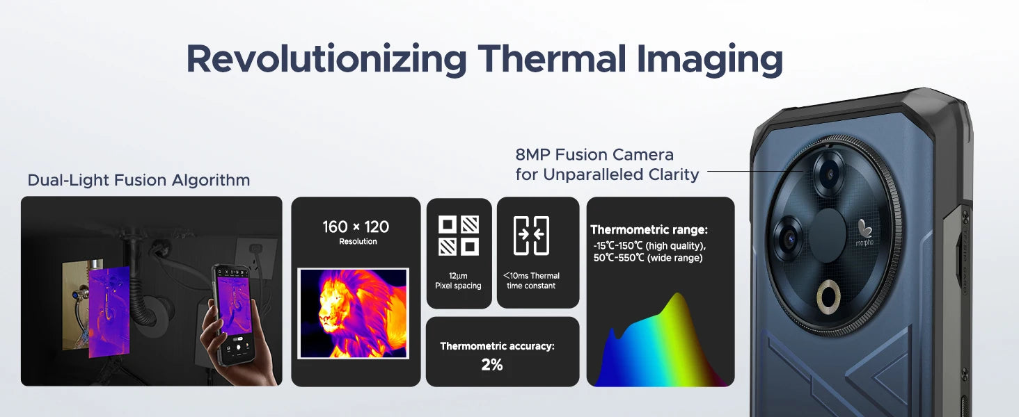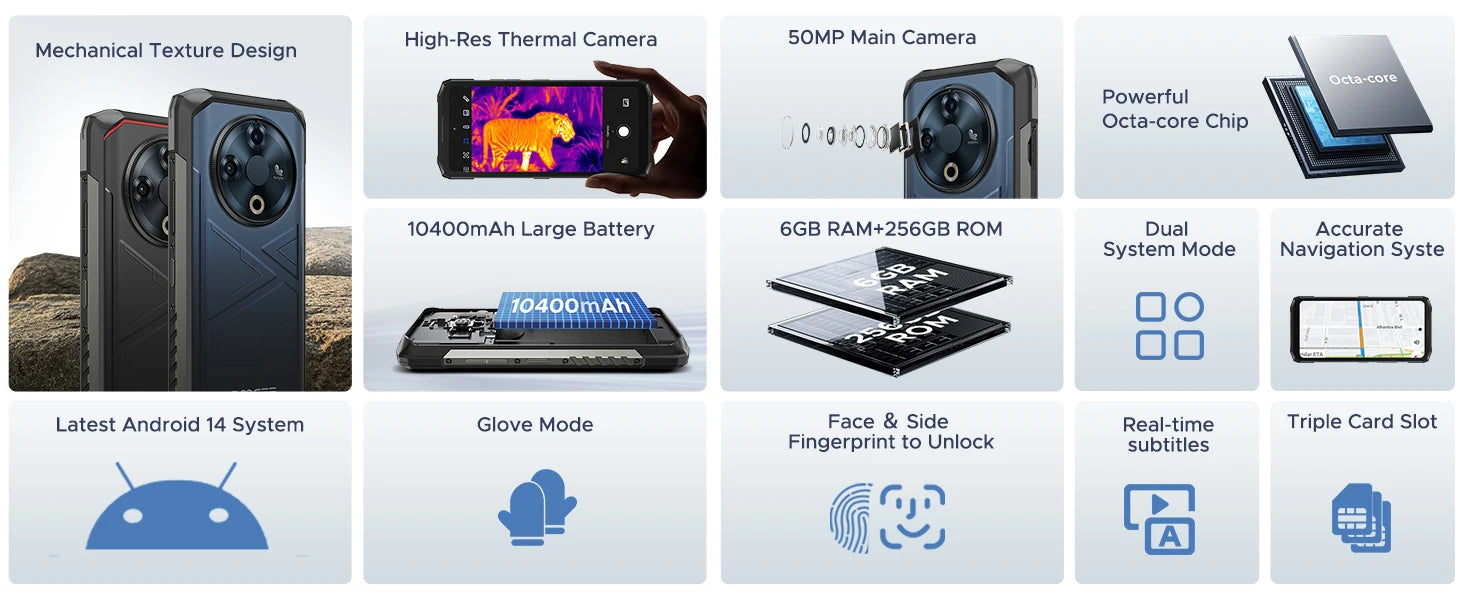 - Funktionalität: Wärmebildkamera, 50 MP Hauptkamera + 8 MP Frontkamera, 6,56" IPS Display, 90 Hz, Android 14