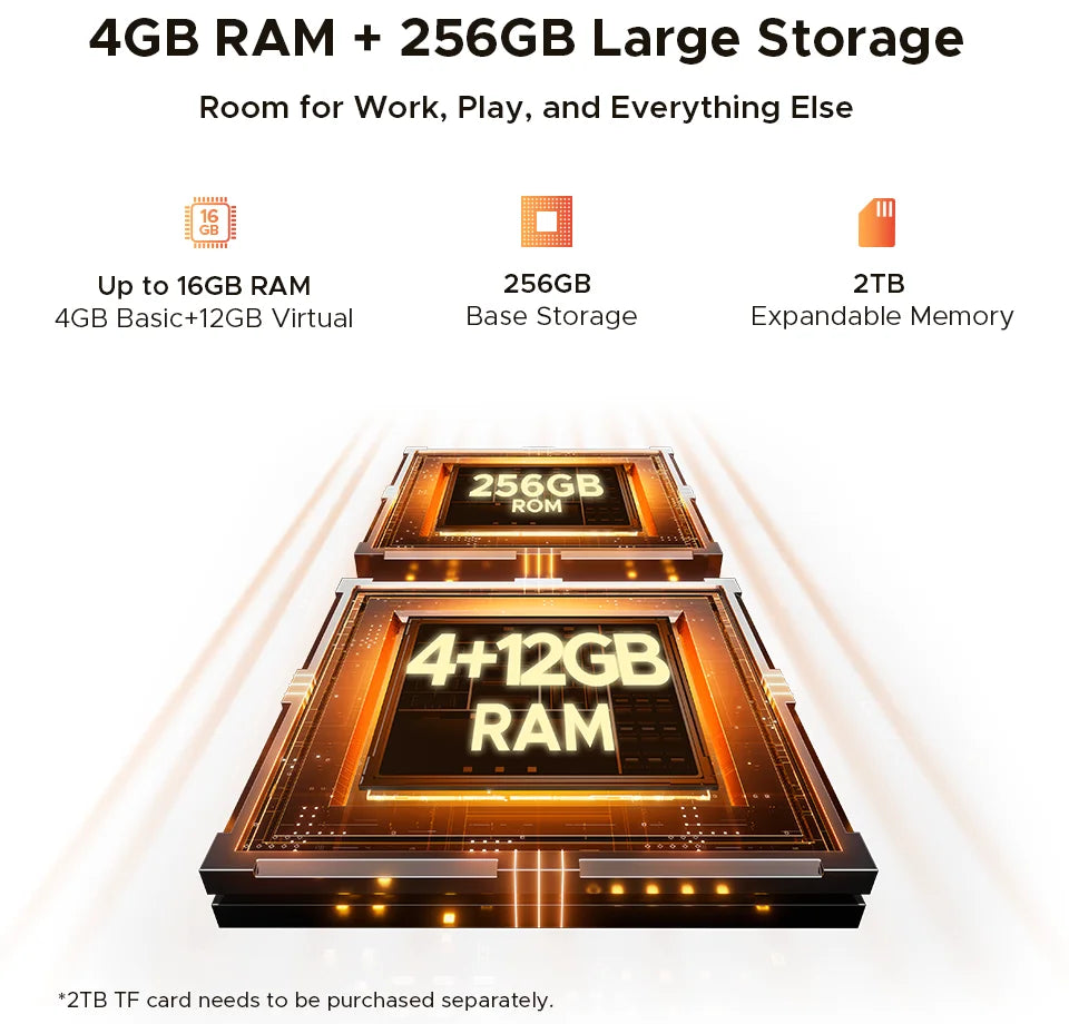 - Großer Speicherplatz: 256 GB ROM, erweiterbar per TF-Karte bis zu 2 TB – ausreichend Platz für Fotos, Videos und Apps, ohne ständig löschen zu müssen.