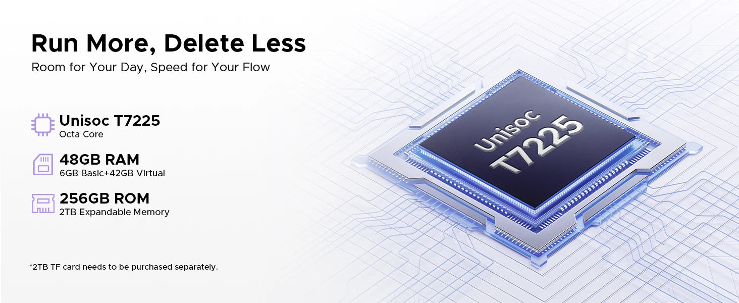 - Unisoc T7225 CPU liefert flüssige App-Wechsel, Navigation, Messaging und Streaming.
