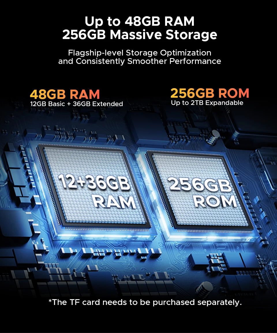 - RAM- und Storage-Power: Bis zu 48 GB RAM (12 GB fest + bis zu 36 GB erweiterbar) und 256 GB ROM, plus Unterstützung für MicroSD-Karten bis 2 TB.