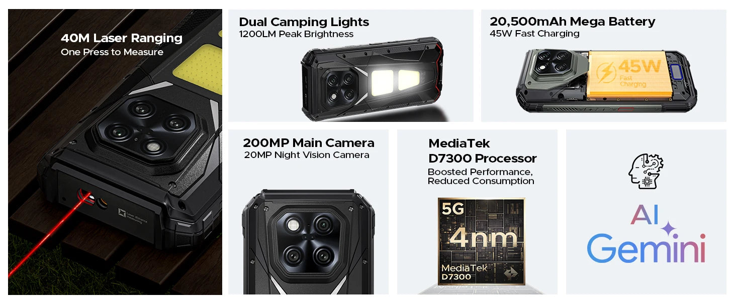 Der DOOGEE V Max LR vereint Laser-Entfernungsmesser, modernes Android-Smartphone-Design und eine leistungsstarke Akku-Power in einem robusten Gehäuse. Er erleichtert präzises Arbeiten an Baustellen, im Handwerk und unterwegs, spart Zeit bei Messungen und steigert Ihre Produktivität deutlich. Dank des großen Displays, der fortschrittlichen Kamera-Architektur und der umfassenden Konnektivität behalten Sie auch in anspruchsvollen Situationen den Überblick – ganz ohne Kompromisse.