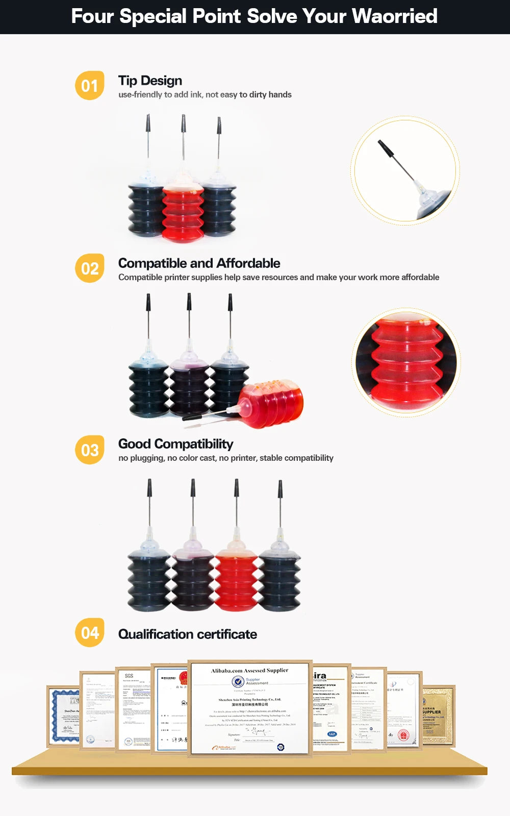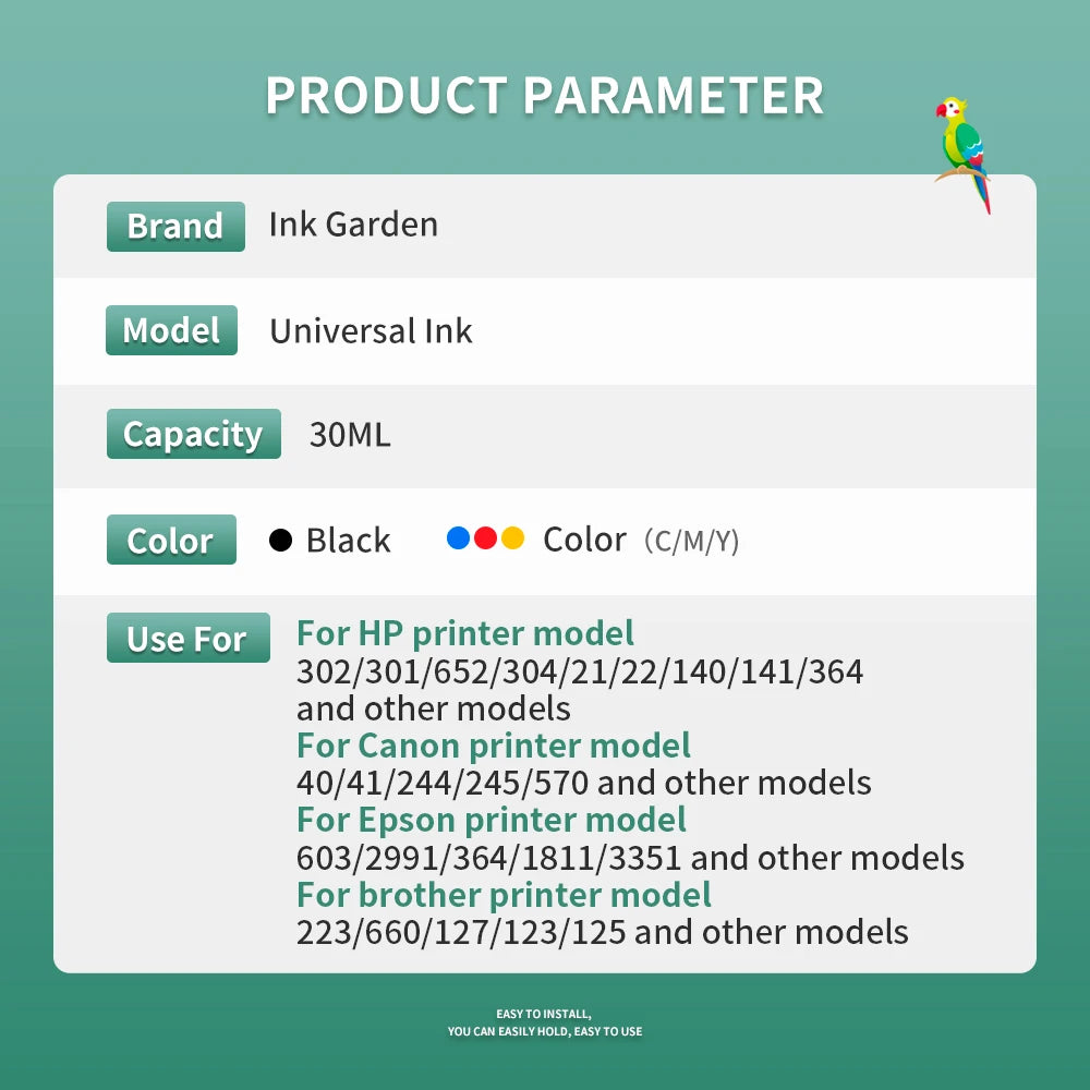 - Breite Kompatibilität mit Canon-PD-Patronen (z. B. PGI-245, PGI-240) sowie HP-Serien (HP 301/302/304/652/545/902/952) und kompatiblen Modellen von Brother, Epson und weiteren Herstellern, die Farbstofftinte verwenden.
