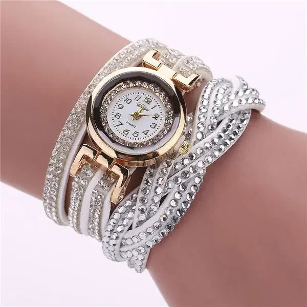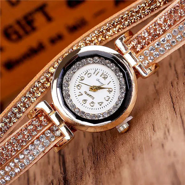 Damen-Uhr 2025: MOONBIFFY Fashion Casual Gold Quartz Women Rhinestone Watch - Braided Leather Bracelet Watch Gift Ladies Wristwatch Relogio Feminino Gift Collection