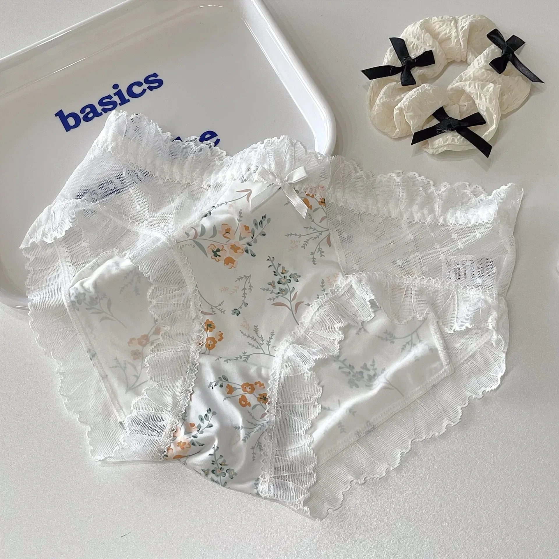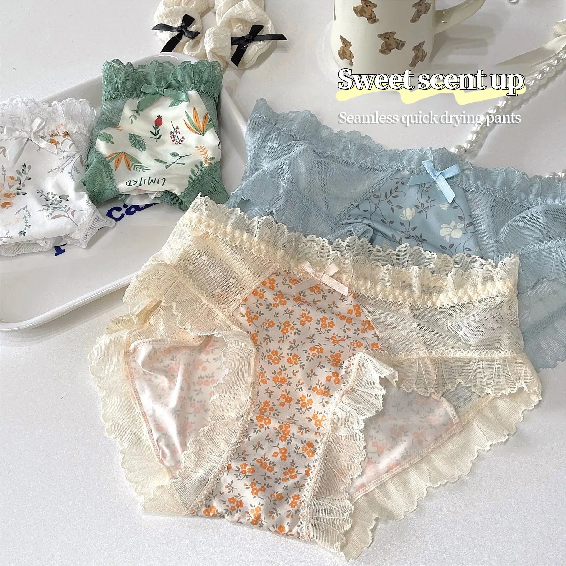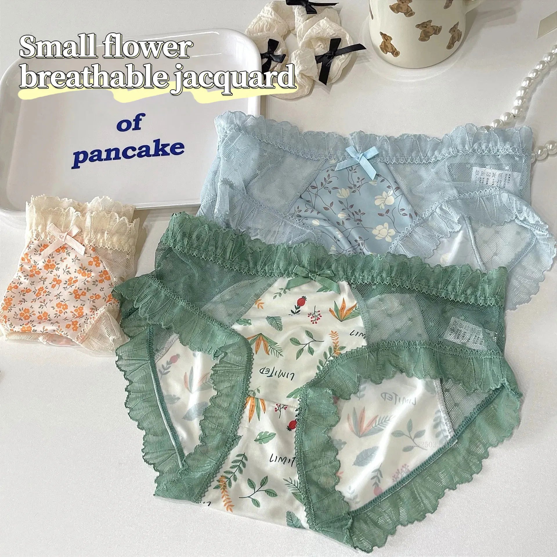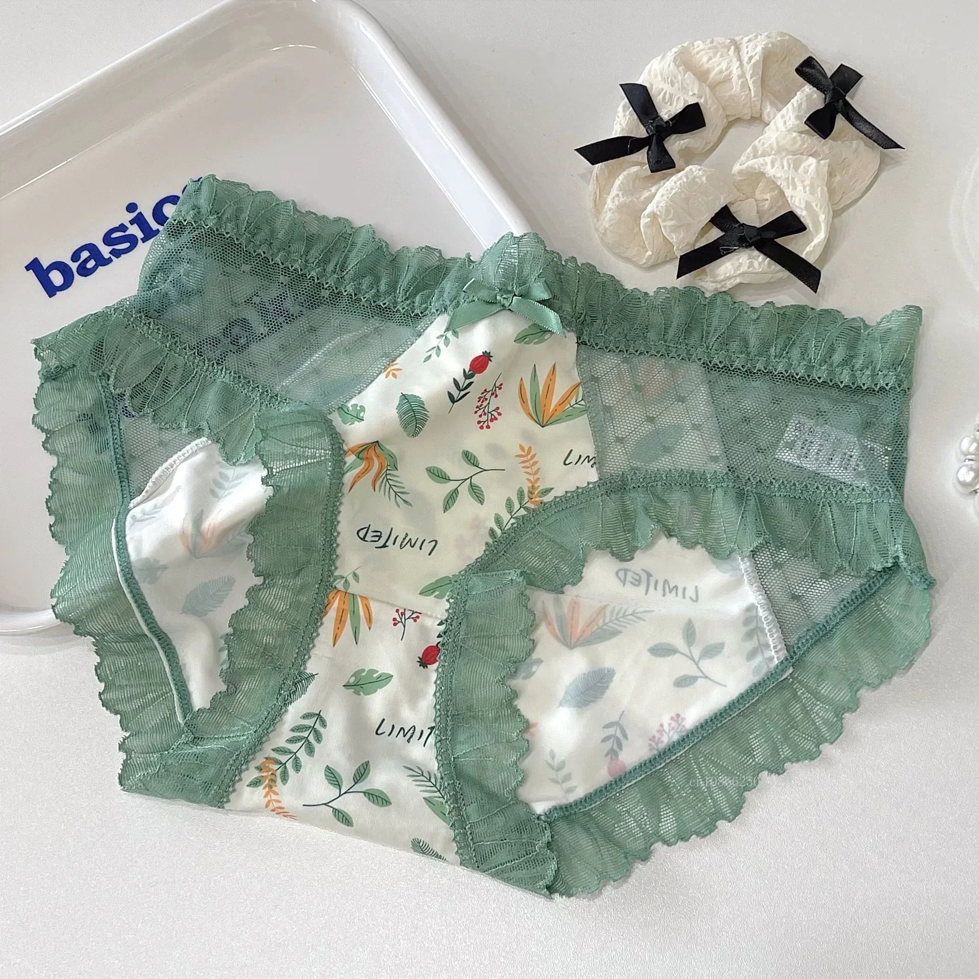 Floral Lace Women's Panties Middle Waist Plus Size Fashion Ice Silk Briefs Quick-drying Cotton Crotch Underpants Female Lingerie