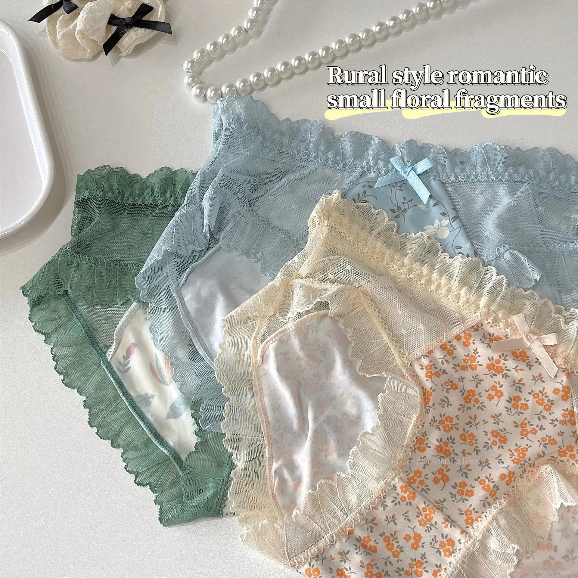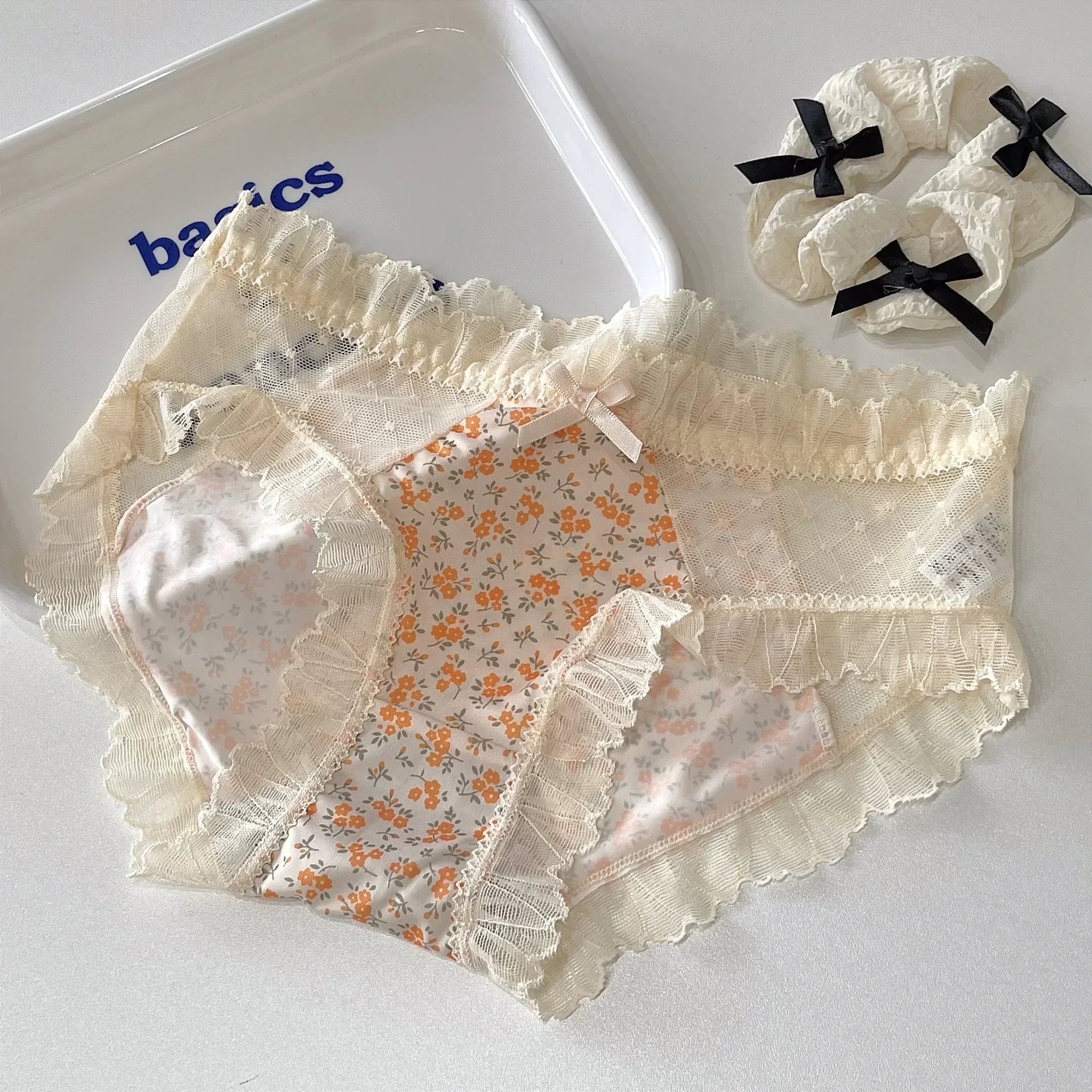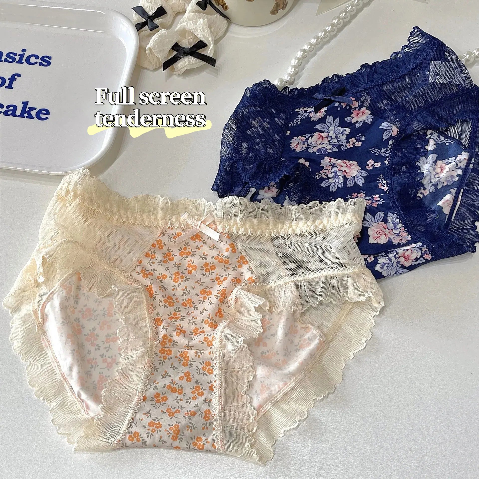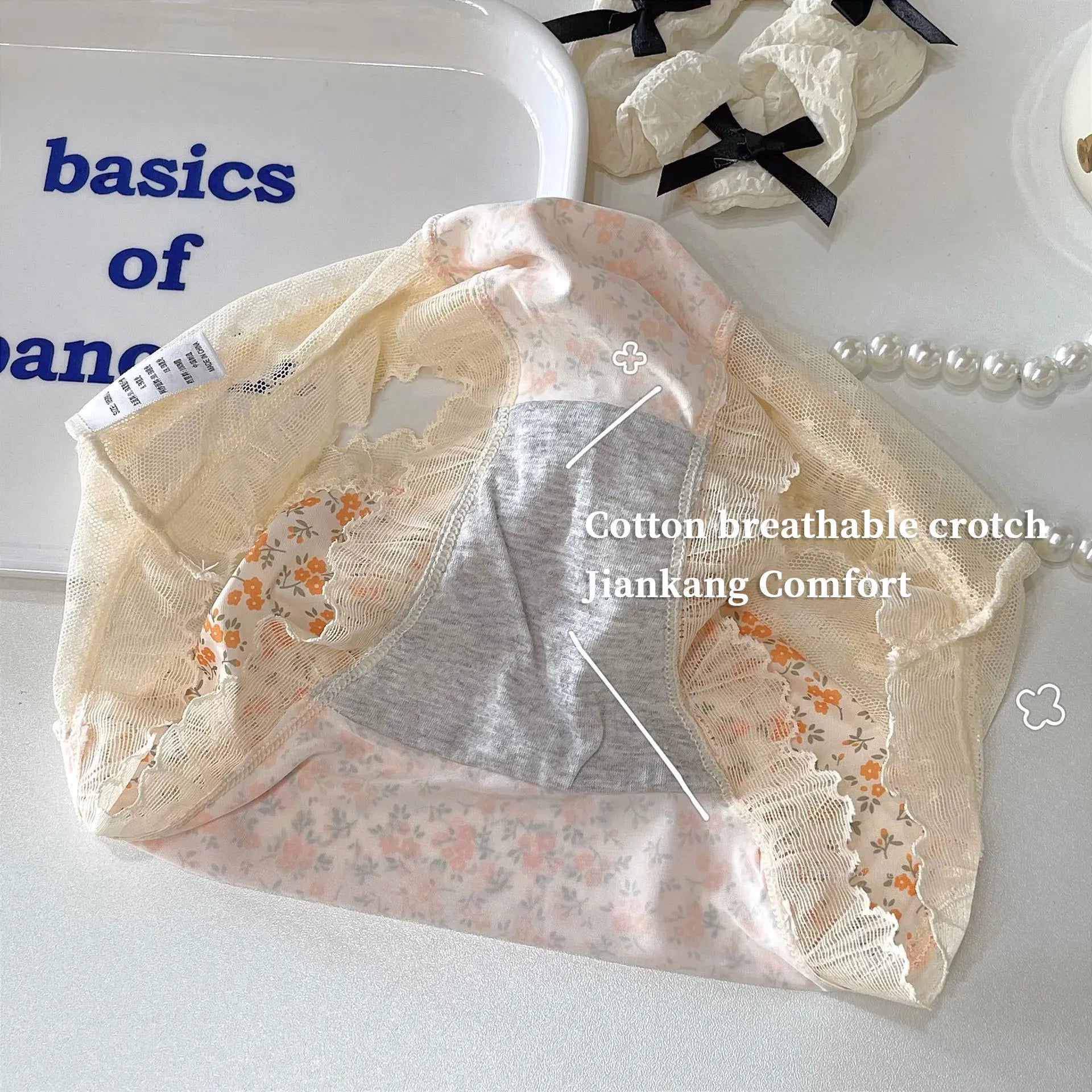 Floral Lace Women's Panties Middle Waist Plus Size Fashion Ice Silk Briefs Quick-drying Cotton Crotch Underpants Female Lingerie