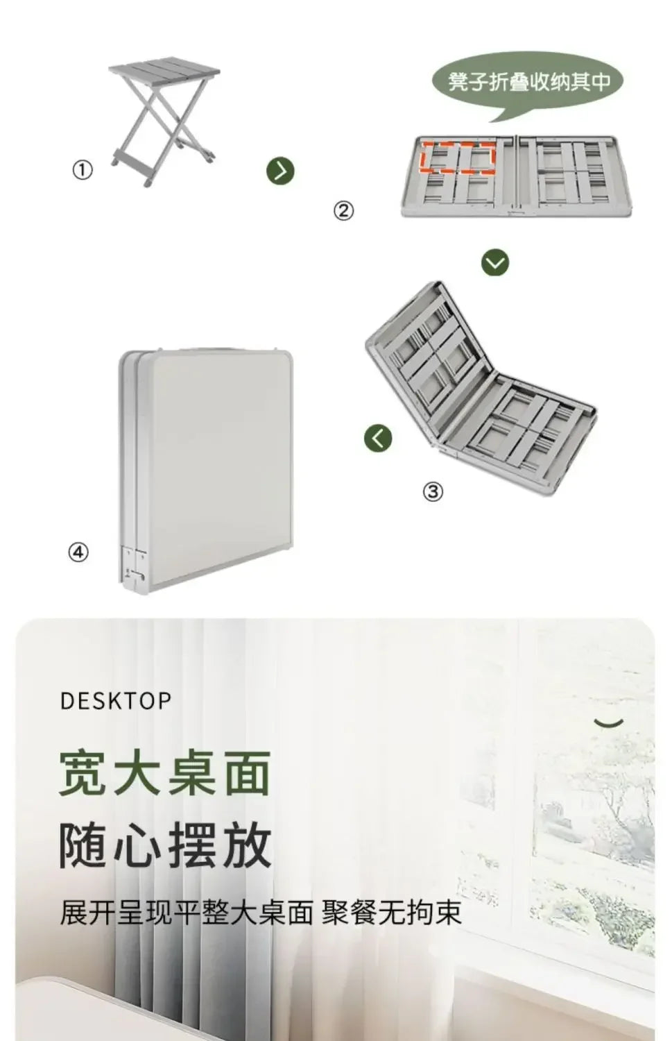 Dieses kompakte, faltbare Tischsystem bietet maximale Funktionalität und Flexibilität für Mietwohnungen, kleine Essbereiche, Verkaufsstände und Studentenwohnheime – perfekt, wenn platzsparende und robuste Möbel gefragt sind.