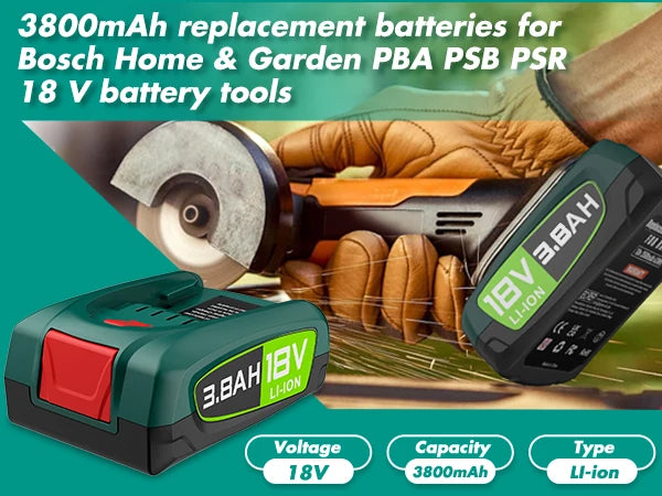 Erhöhen Sie die Einsatzdauer Ihrer 18V Bosch-kompatiblen Werkzeuge mit einer leistungsstarken 3800mAh Li-Ion Ersatzbatterie für unterbrechungsfreies Arbeiten. Diese Batterie wurde speziell entwickelt, um professionelle Handwerker, Heimwerker und Industrieanwender mit stabiler Energie, schneller Rückkehr in die Arbeit und zuverlässiger Leistung zu unterstützen. Ideal als Austausch- oder Zusatzakku für eine Vielzahl von Bosch PBA-kompatiblen Geräten.