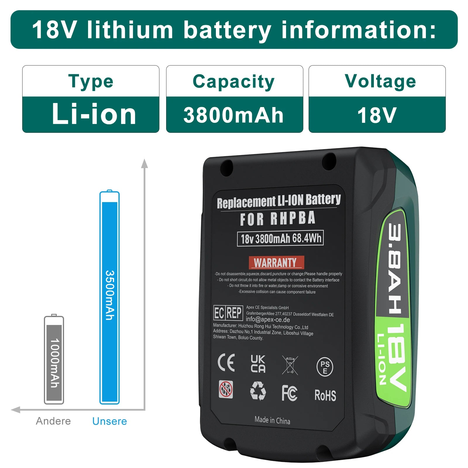 Diese For Bosch 18V 3800mAh Ersatzbatterie ist eine professionelle Lösung für Anwender, die Wert auf zuverlässige Leistung, einfache Handhabung und konforme Sicherheitsstandards legen. Sie bietet eine spürbare Verlängerung der Betriebszeit, hohe Kompatibilität mit gängigen 18V-Werkzeugen und eine robuste Bauweise, die sich auch in anspruchsvollen Einsatzumgebungen bewährt. Durch die Kombination aus zertifizierter Sicherheit und praktischer Nutzbarkeit ist dieser Akku eine sinnvolle Investition für jeden, der seine elektrische Ausrüstung effizient betreiben möchte.