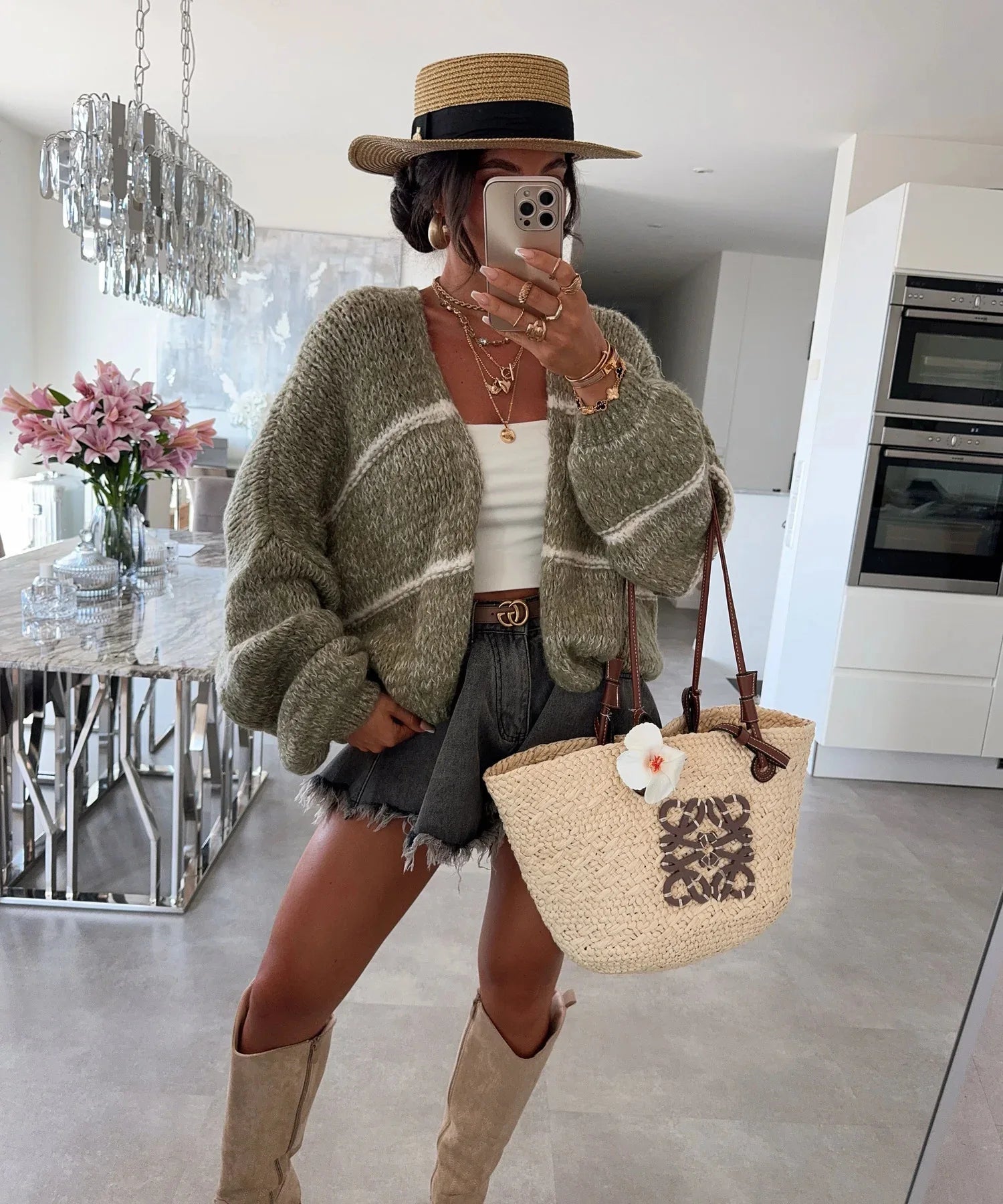 - Streifenmuster und grobes Garn schaffen eine zeitgemäße Optik, die zu Jeans, Röcken oder Kleidern kombiniert werden kann.