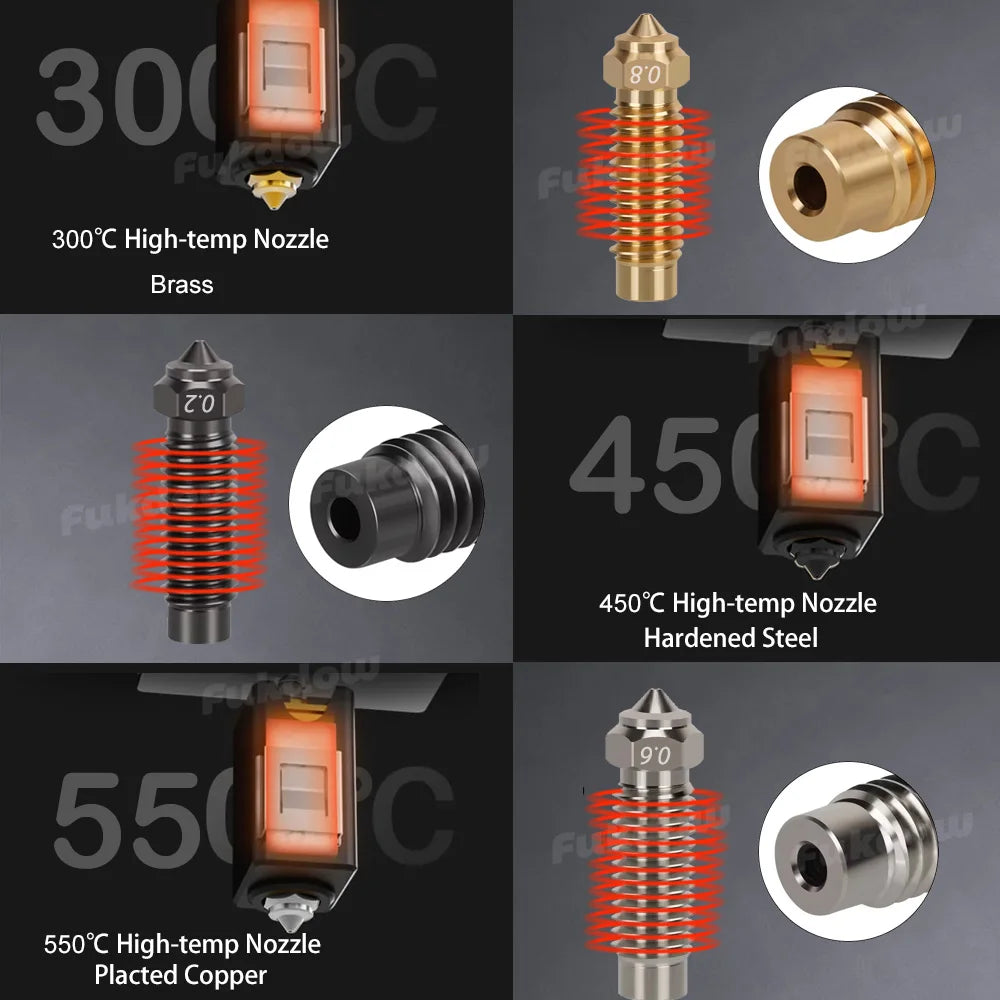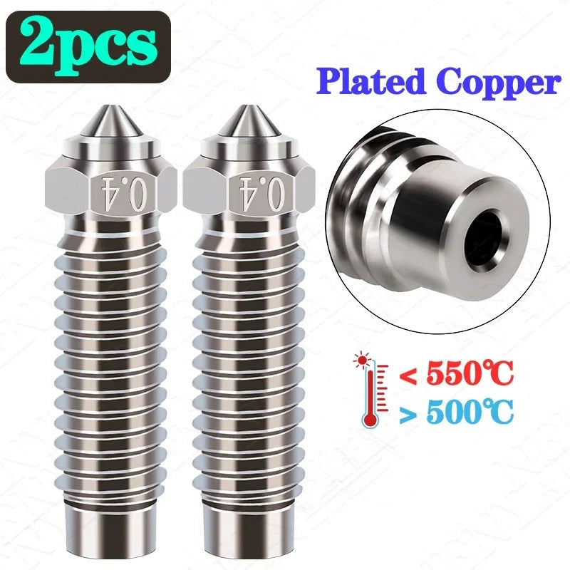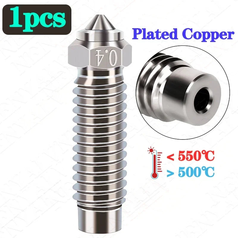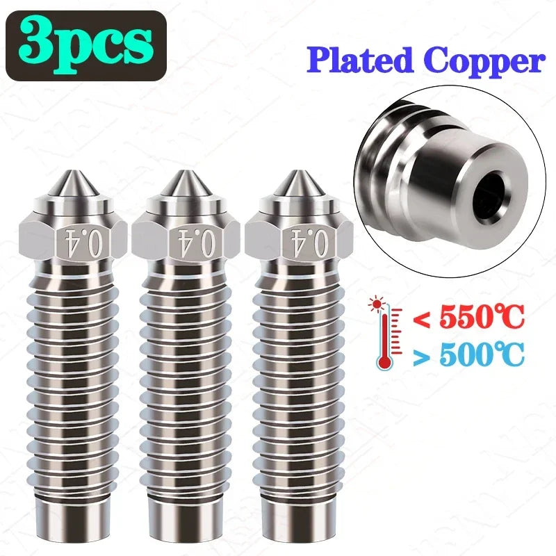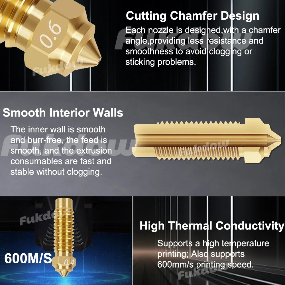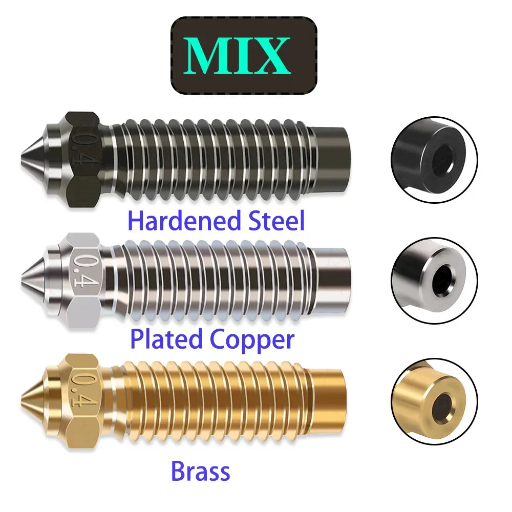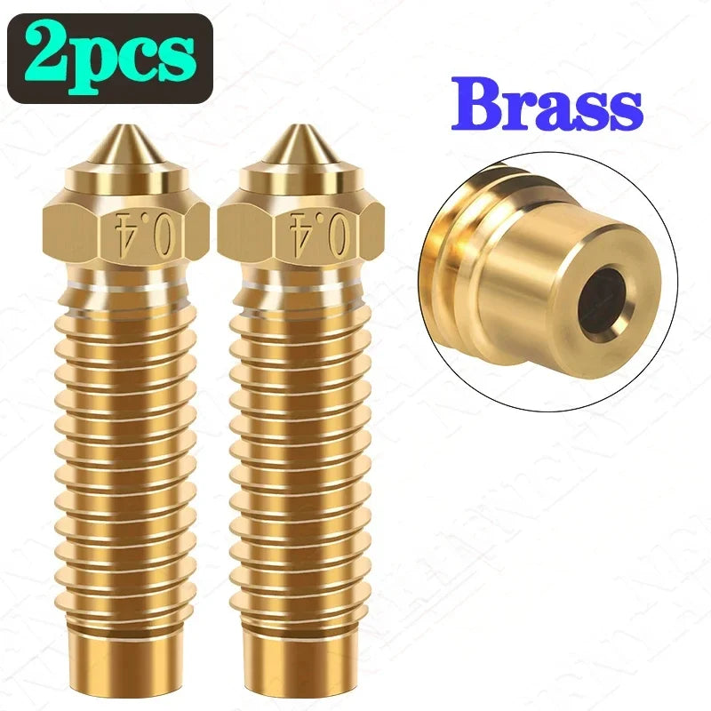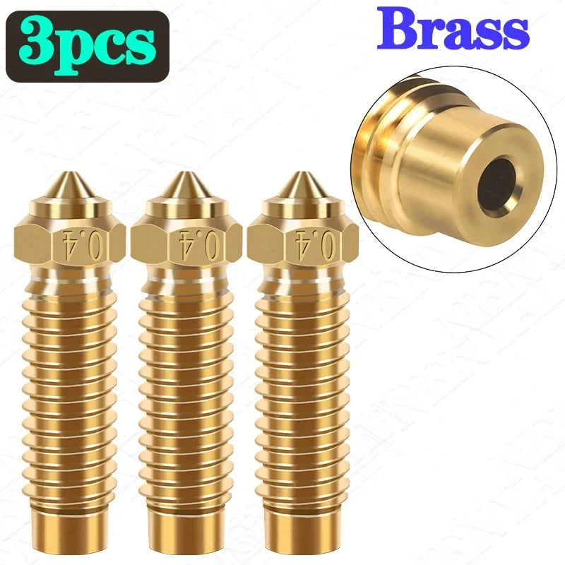 Erzielen Sie gleichmäßigere Drucke, kürzere Druckzeiten und eine verlängerte Lebensdauer Ihrer Düsen durch präzise gefertigte Nozzles aus gehärtetem Messing und Kupferbeschichtung.