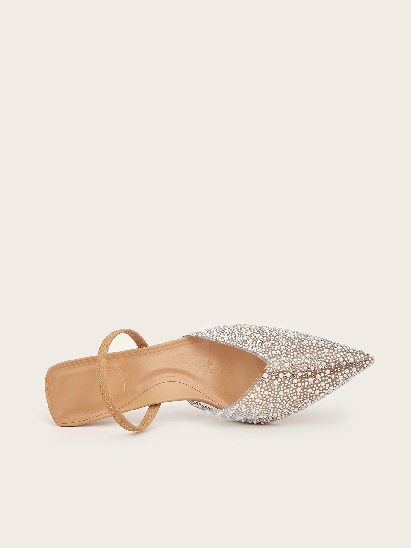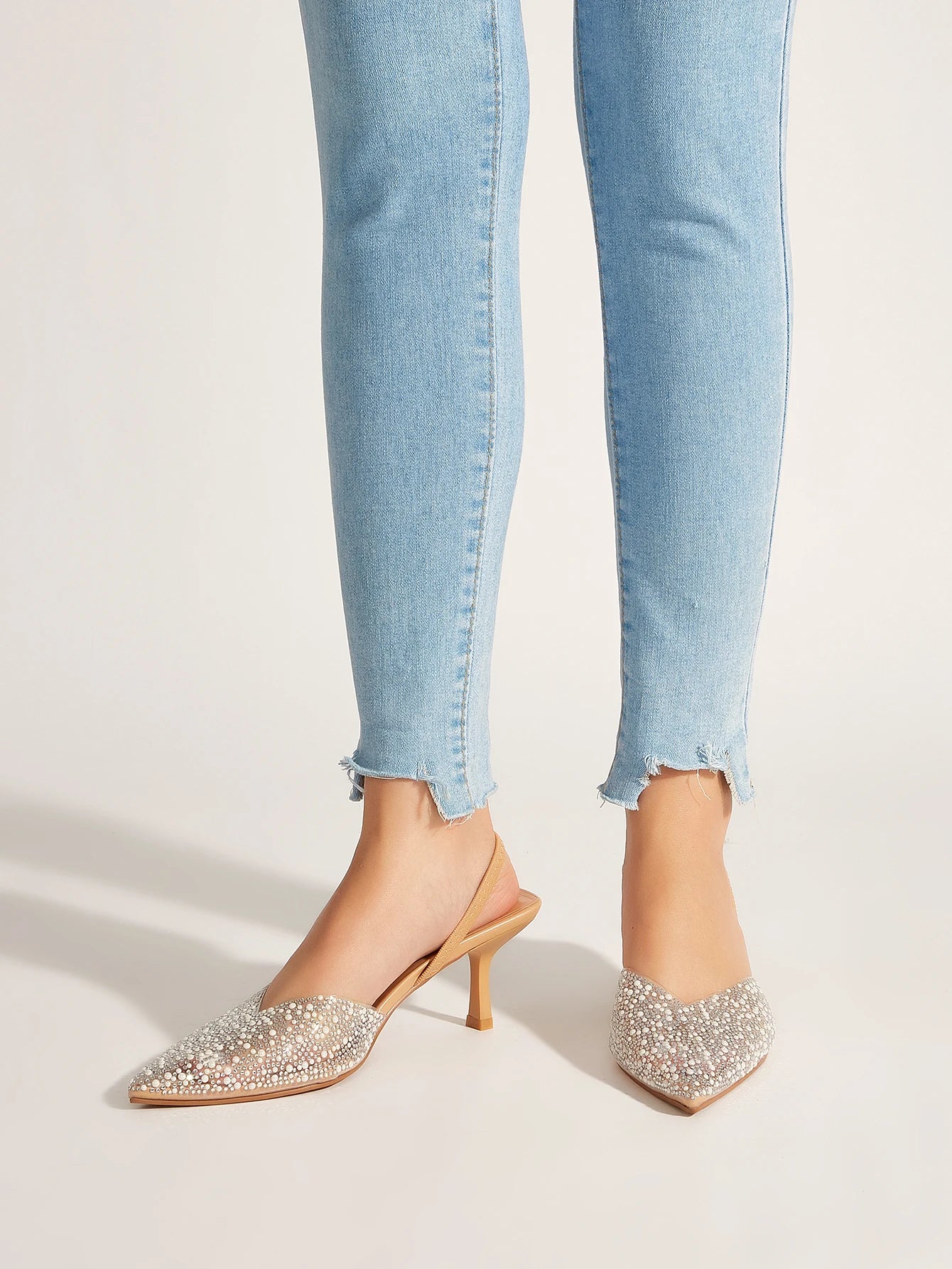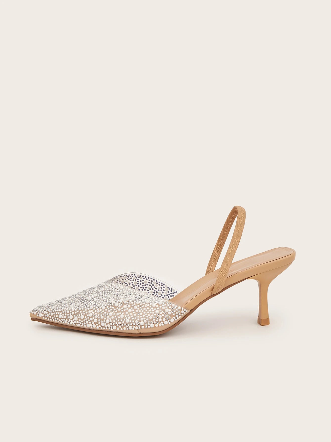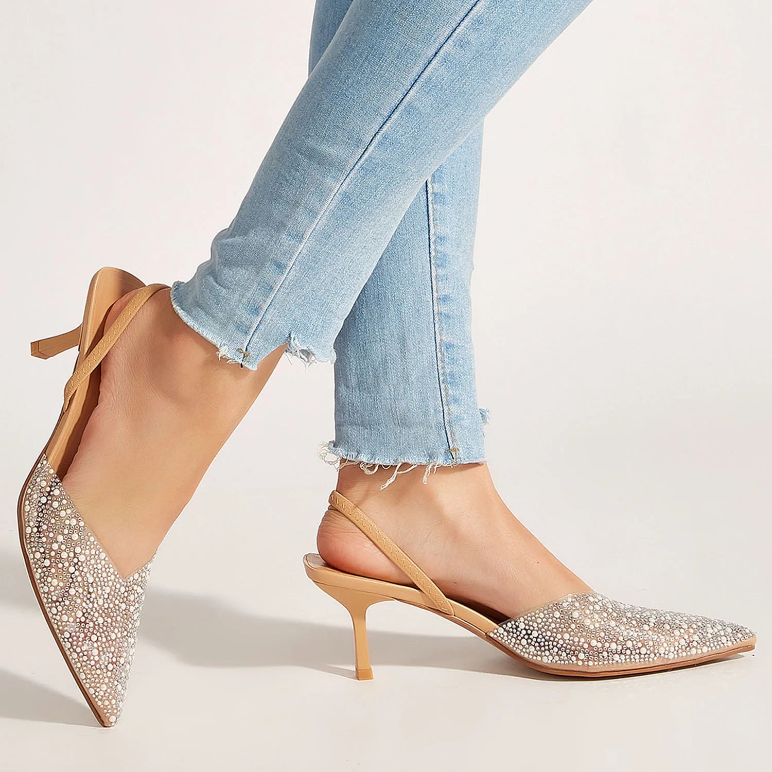 Diese Slingback-High-Heels kombinieren funkelnde, transparente Perlenapplikationen mit einem leichten Design, das langen Tragekomfort bei formellen Anlässen und sommerlichen Outfits bietet. Die Sandalen setzen gezielte Akzente, verlängern optisch das Bein und sorgen für ein gepflegtes Erscheinungsbild bei besonderen Gelegenheiten.