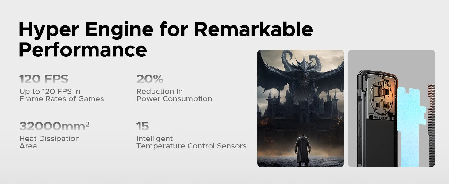 - Android 14-Nutzeroberfläche mit Gaming-Modus, der Hintergrundprozesse optimiert und Ressourcen priorisiert.