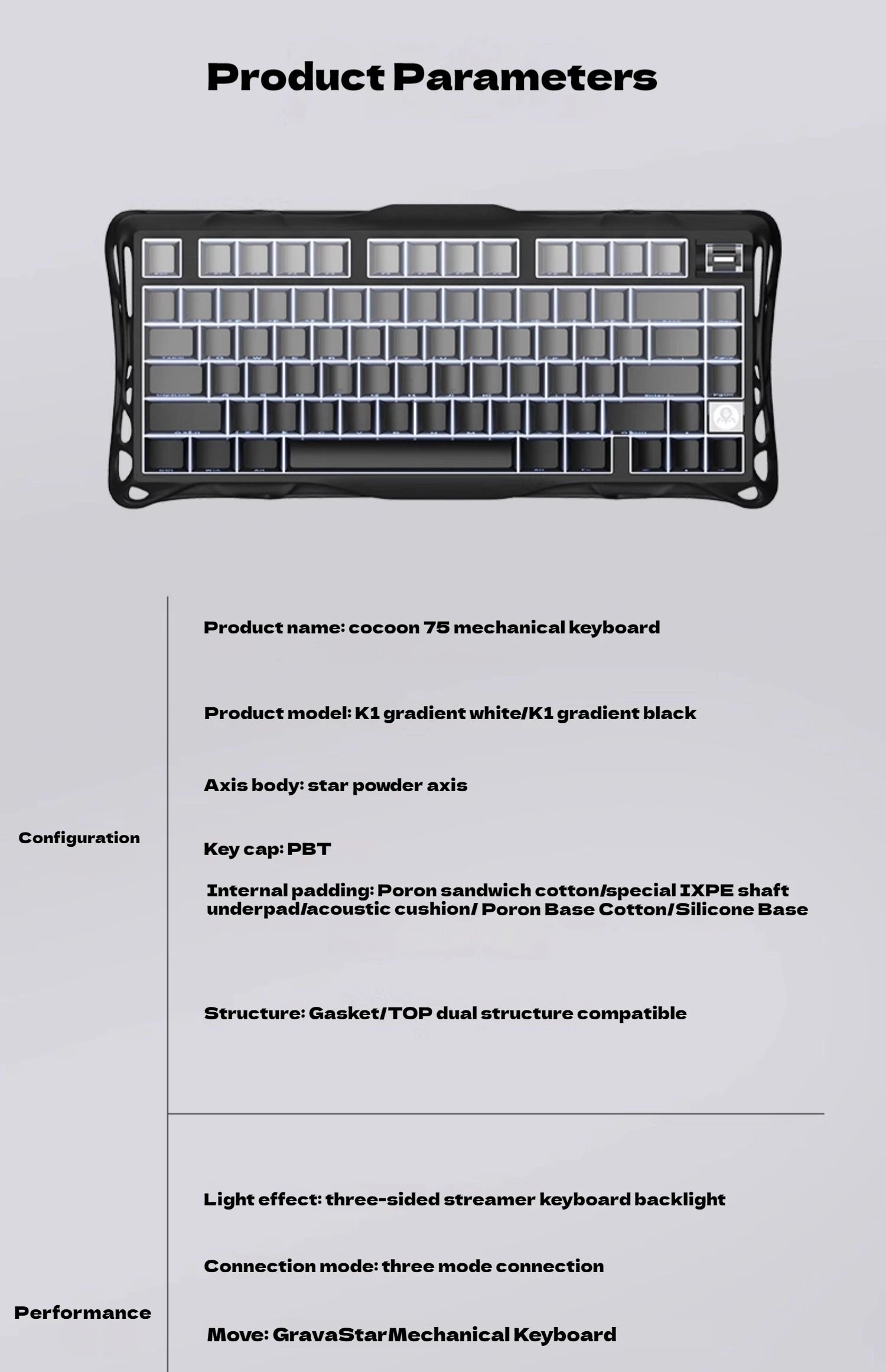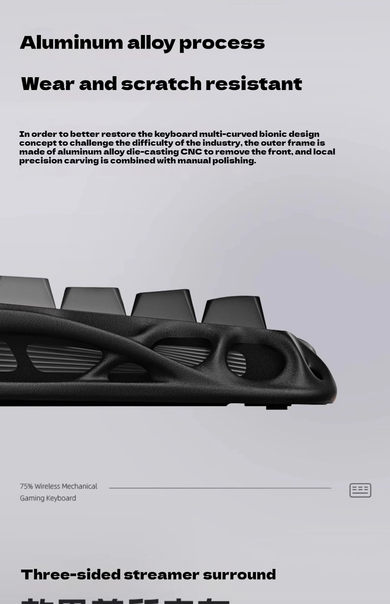 Die Gravastar 75k1 mechanische Tastatur wurde konzipiert, um die Anforderungen moderner Nutzer zu erfüllen: präzises Tippgefühl, flexible Konnektivität und eine ansprechende, individuelle Beleuchtung. Durch das ausgewogene 75%-Layout profitieren Anwender von einer kompakten Bauweise ohne Verzicht auf wichtige Funktionstasten. Das Aluminiumgehäuse verleiht der Tastatur nicht nur eine elegante Optik, sondern erhöht auch die Stabilität und das Gefühl von Qualität bei jeder Berührung.