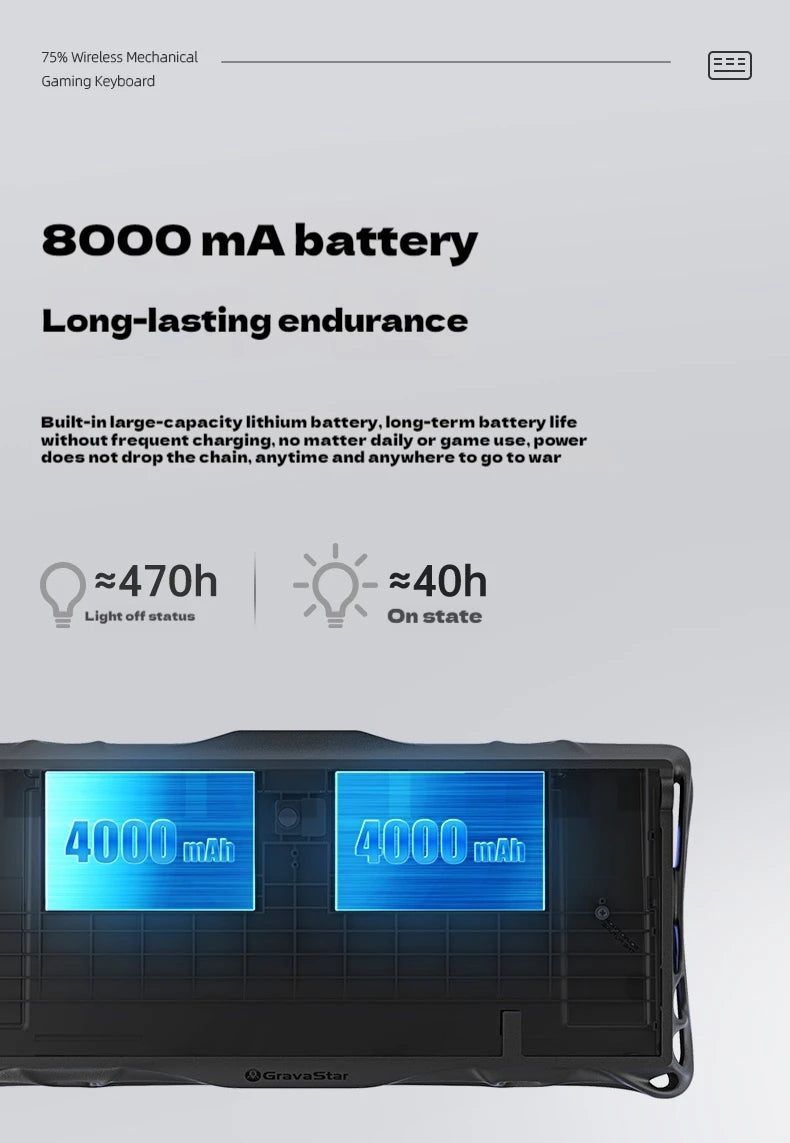 Die Kombination aus Bluetooth- und 2,4-GHz-Funkverbindung ermöglicht eine nahtlose Integration in bestehende Setups. Ob im Büro, im Home-Office oder unterwegs – die Gravastar 75k1 passt sich Ihrem Arbeitsumfeld an. Die integrierte Batterie unterstützt kabellosen Betrieb und reduziert Kabelgewirr, während die RGB-Beleuchtung gezielte Sichtbarkeit und eine individuelle Gestaltung Ihres Arbeitsbereichs erlaubt.