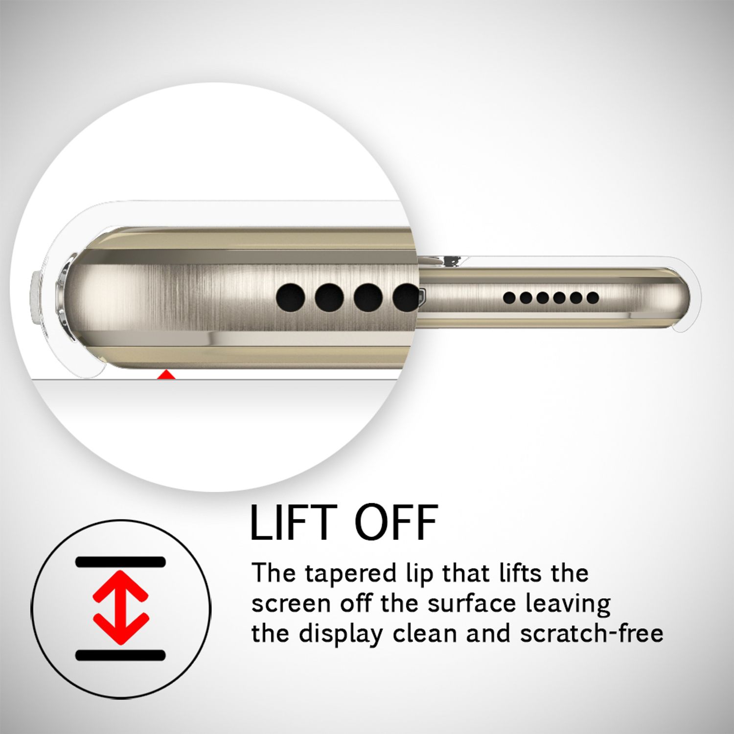 - Der etwas überstehende Rahmen verhindert direkten Kontakt zwischen Display und harten Oberflächen, sodass Kratzer reduziert werden.