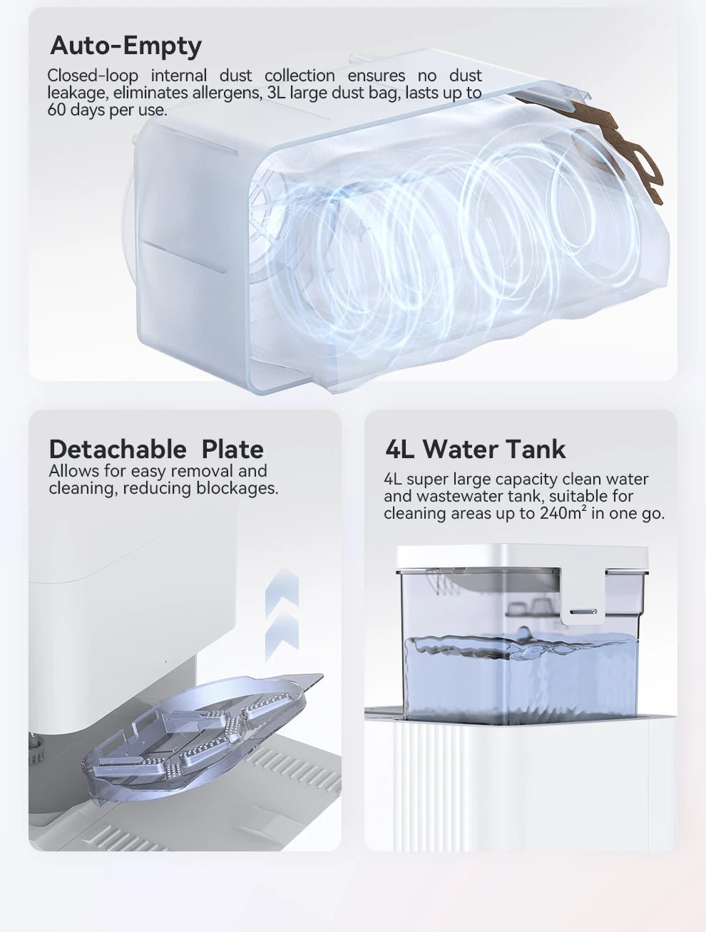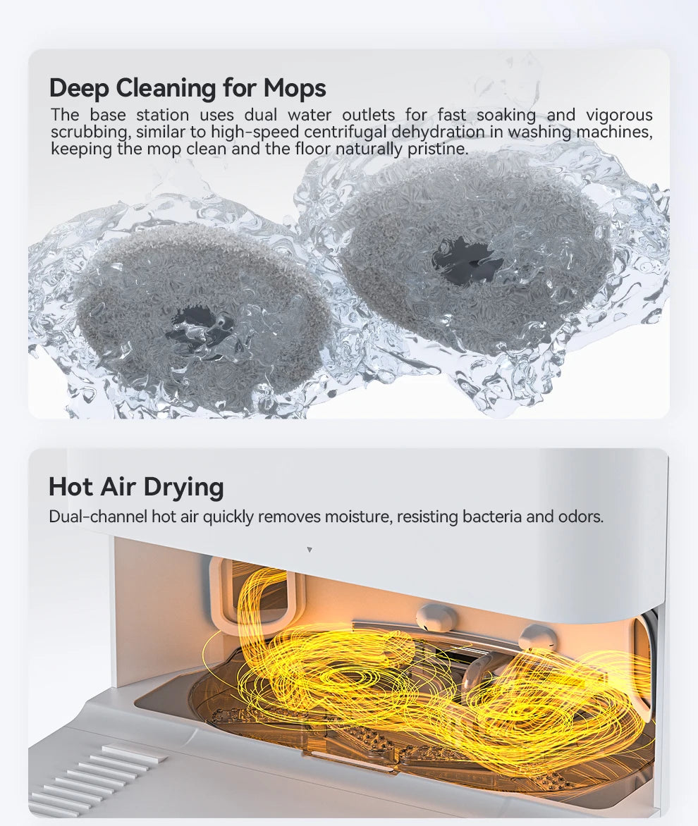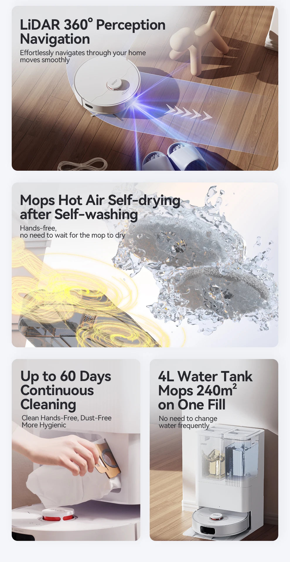 Integrierte Nass- und Trockenreinigung kombiniert mit robuster Saugleistung – für saubere Böden in allen Bereichen Ihres Zuhauses. Dieser Robotersauger bietet eine leistungsstarke Mischung aus Staubaufnahme, effizienten Reinigungsmethoden und intelligenter Pfadsteuerung, damit Sie weniger Zeit mit Putzen verbringen und mehr Zeit genießen können. Durch die flexible Wasserführung und die großzügigen Kapazitäten arbeitet das System automatisch sauberer und effektiver, ohne ständige Eingriffe zu erfordern. Perfekt geeignet für Haushalte mit verschiedenen Bodenbelägen sowie für Anwender, die Wert auf eine gründliche Nasspflege legen.