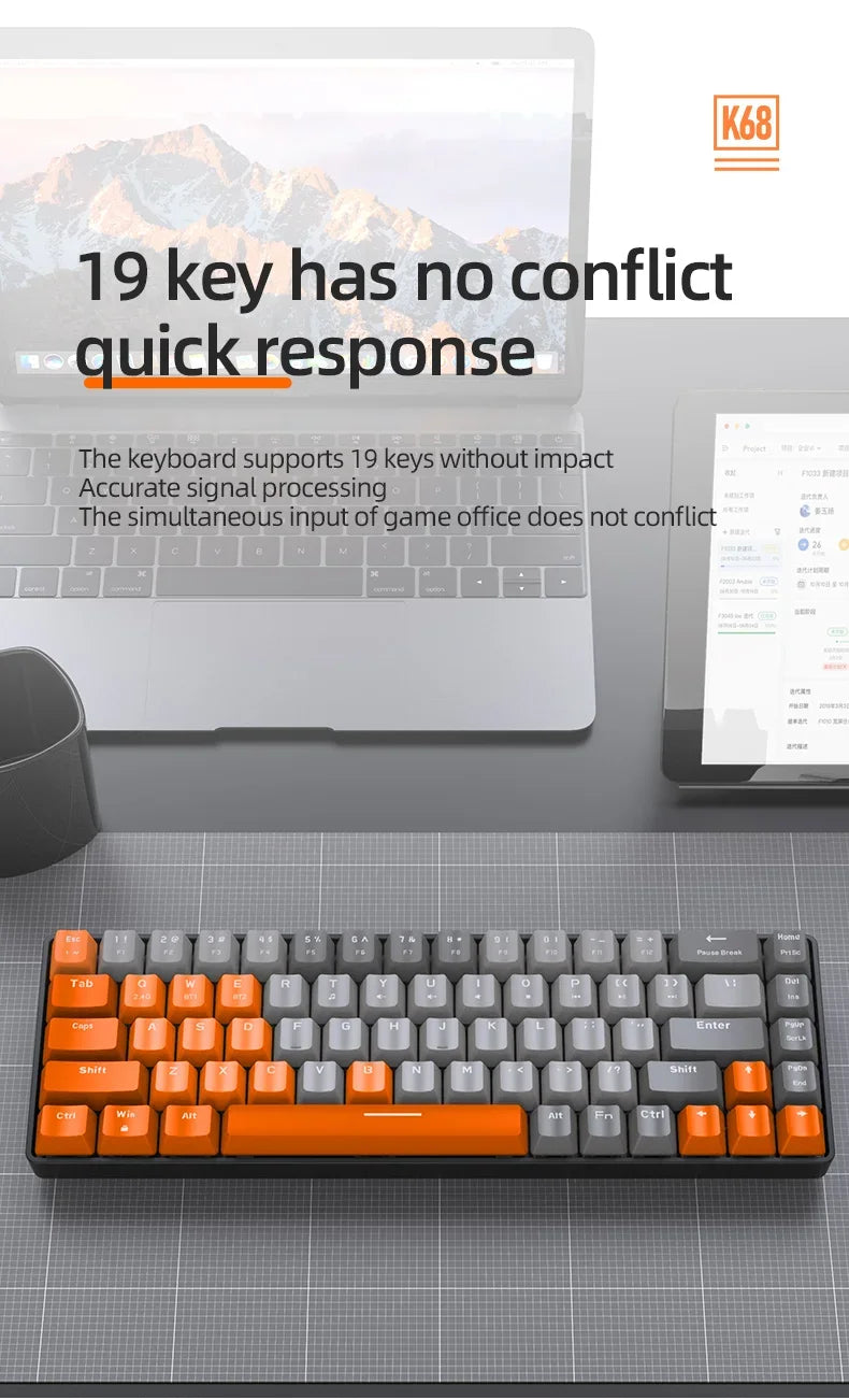 Erleben Sie reaktionsschnelles Gaming und maximale Anpassungsfreiheit mit der kabellosen K68 Mechanical Tastatur – entwickelt für flüssige Eingaben, langlebige Schalter und einfache Individualisierung.
