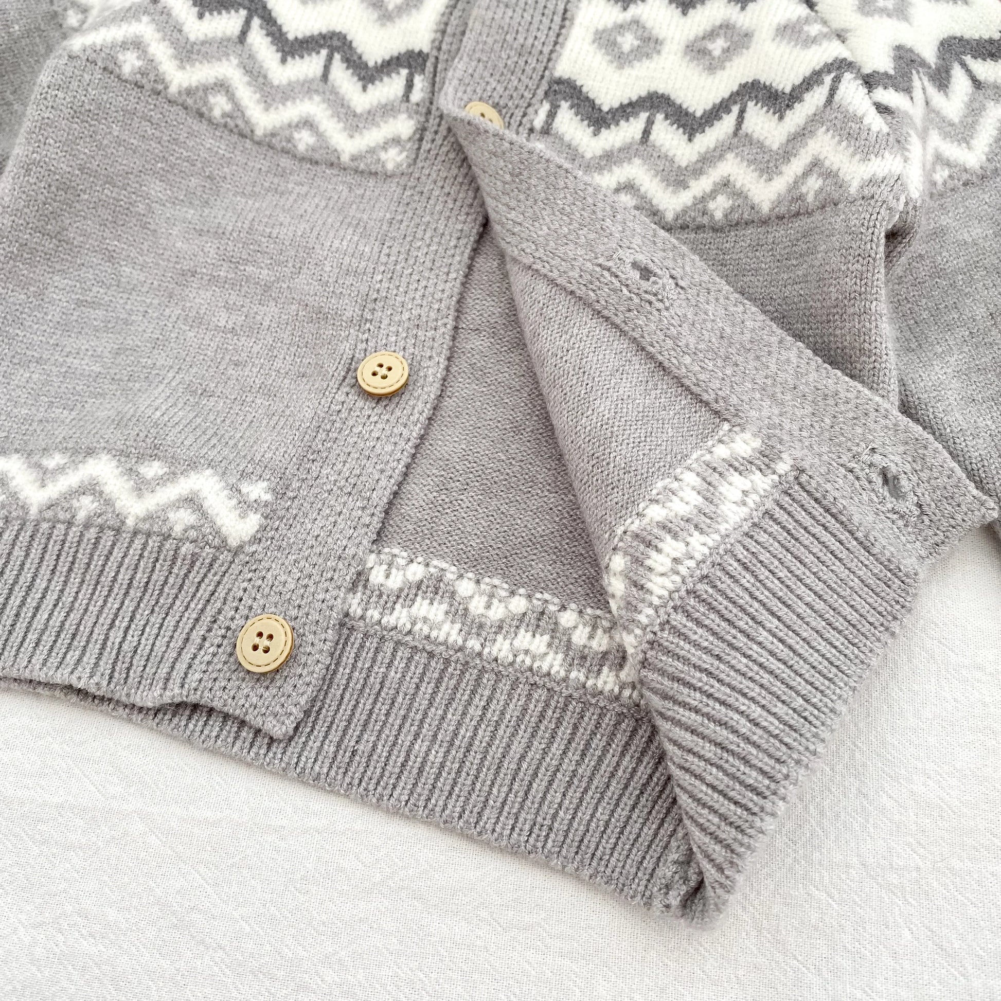 Eltern profitieren von der pflegeleichten Verarbeitung und der robusten Struktur, die auch häufiger Maschinenwäsche standhält. Das klassische Erscheinungsbild in Verbindung mit dem dezenten Print macht die Jacke zu einem vielseitigen Kleidungsstück, das sich problemlos in bestehende Garderoben integrieren lässt. Ob als zusätzliche Schicht bei Ausflügen in die Natur oder als wärmende Zwischenschicht beim Spielen im Park — diese Strickjacke ist ein zuverlässiger Alltagsbegleiter.