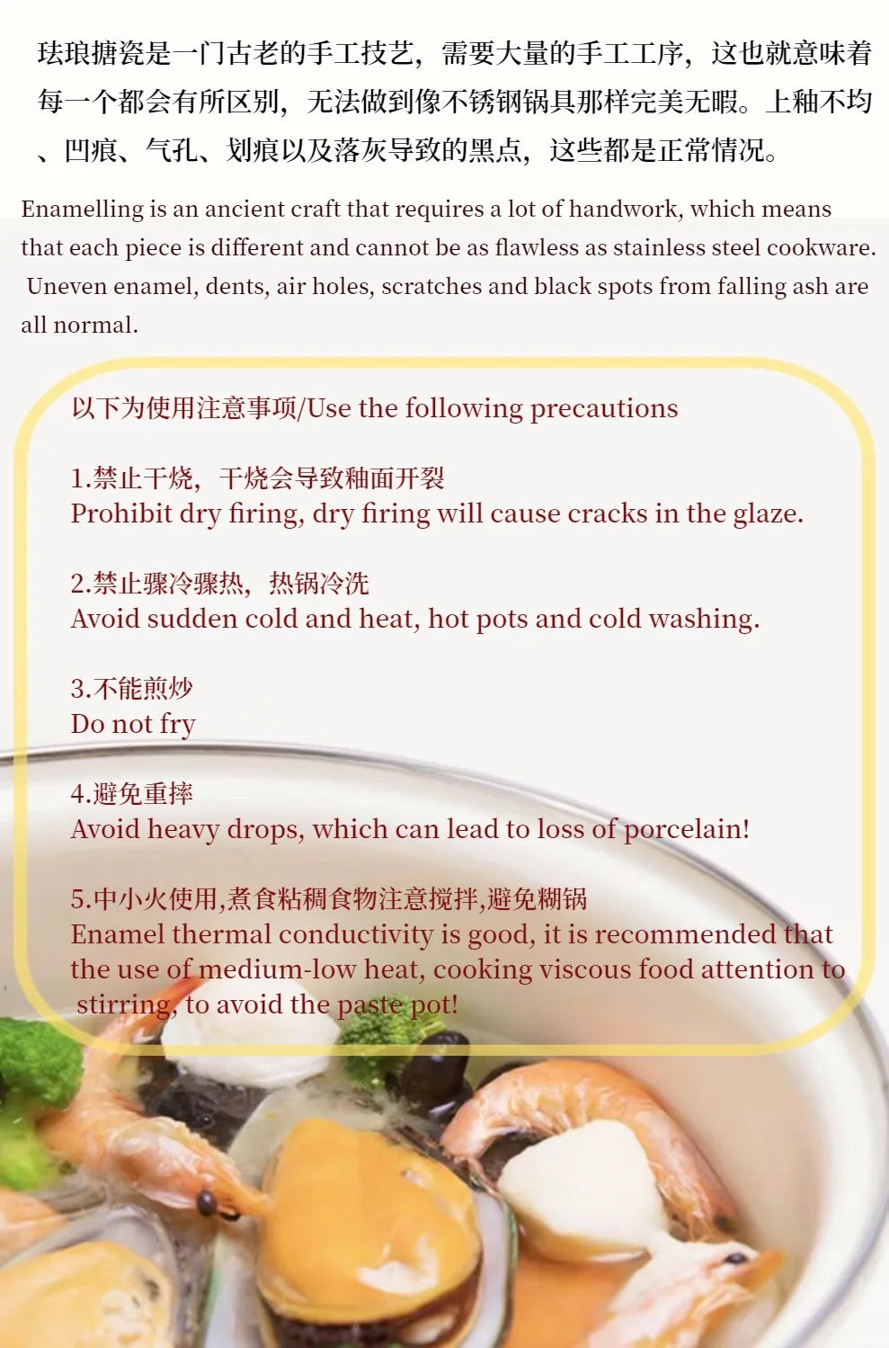 Hinweis zur Pflege: Zur Erhaltung der emaillierten Oberfläche empfehlen wir, starke Stöße und scharfe Metallgegenstände zu vermeiden. Für die Reinigung warme Seifenlauge verwenden und bei Bedarf einweichen, um hartnäckige Rückstände zu lösen. So bleibt das Set langfristig funktional und optisch ansprechend.