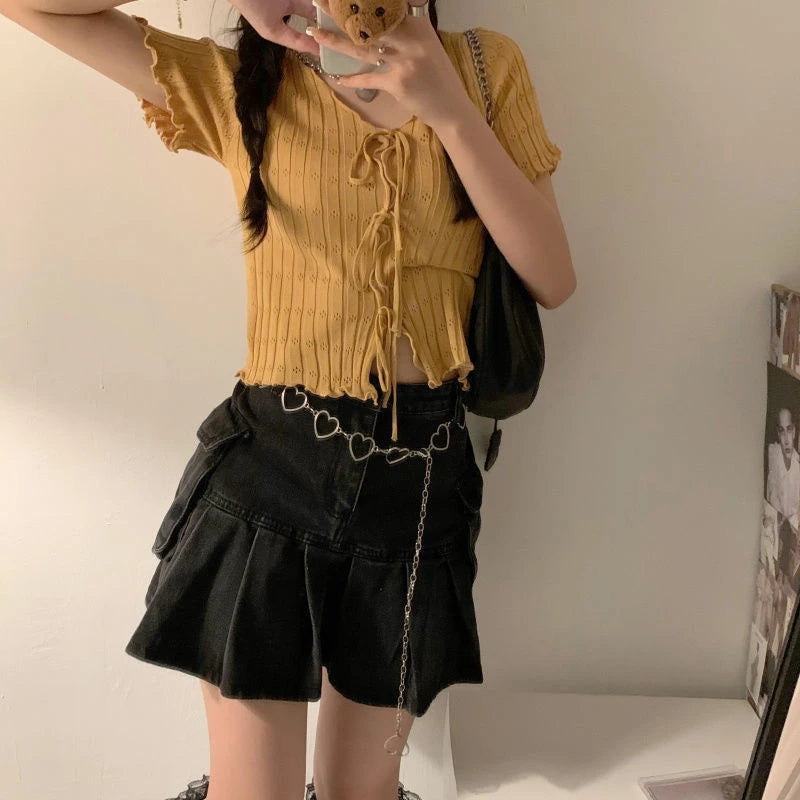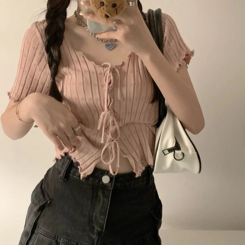 Knitted TShirt For Women V-neck Summer Simple Versatile Casual Crop Tops Bandage Ribbed Short Sleeve Women's Top T-Shirt Girl
