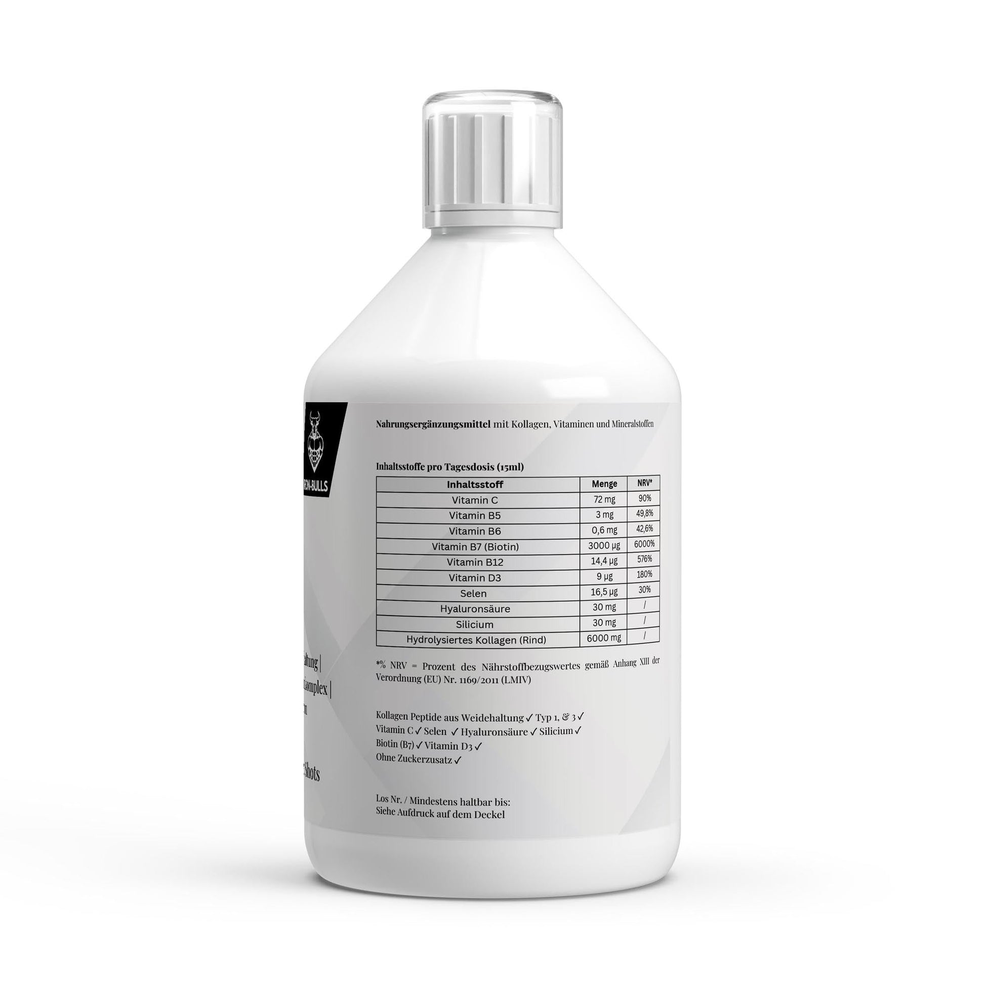 Gefiltertes Wasser, hydrolysiertes Kollagen Typ I & III (mit wichtigen Aminosäuren), Vitamin C, natürliches Erdbeeraroma, natürliche Farbe (lila Kartoffelpulver), Emulgator (Xanthan), Konservierungsstoffe (Kaliumsorbat, Natriumbenzoat), Hyaluronsäure, Silicium, Pantothensäure, Biotin, Vitamin B6, Selen, Süßungsmittel (Steviolglycoside, Sucralose), Säureregulator (Zitronensäure), Vitamin D₃, Vitamin B12.