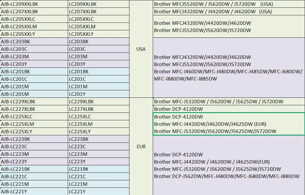 - Kompatibilitätskennzeichnung (LC207, LC205, LC201, LC227, LC225, LC223, LC221) erleichtert Auswahl und Bestandsverwaltung.