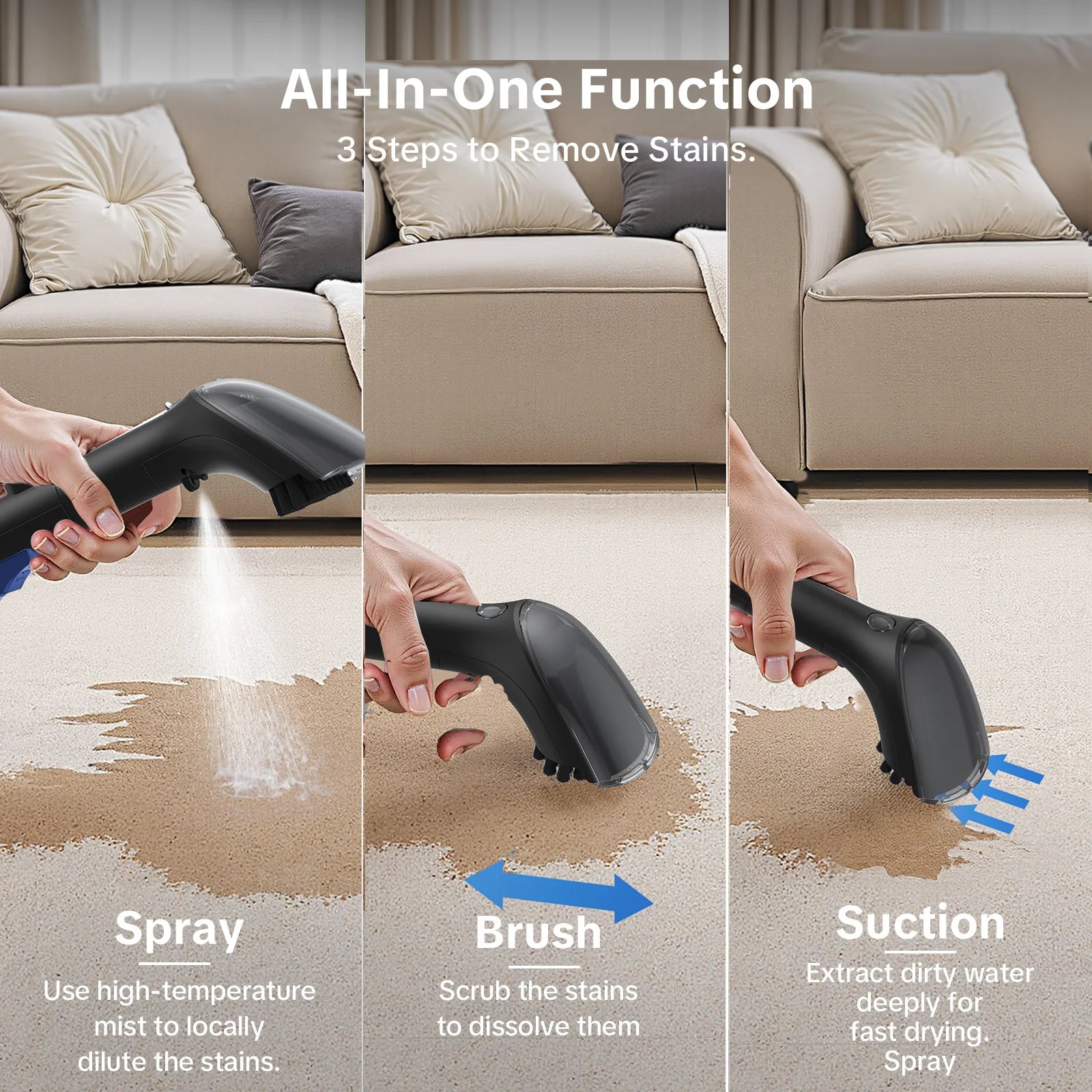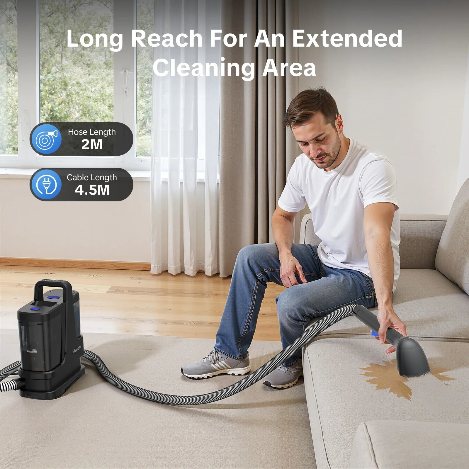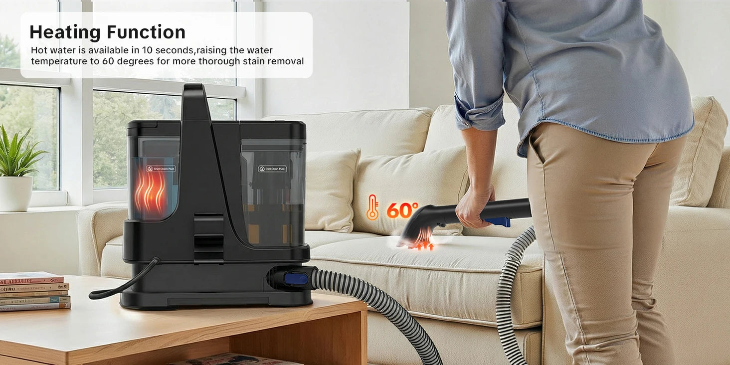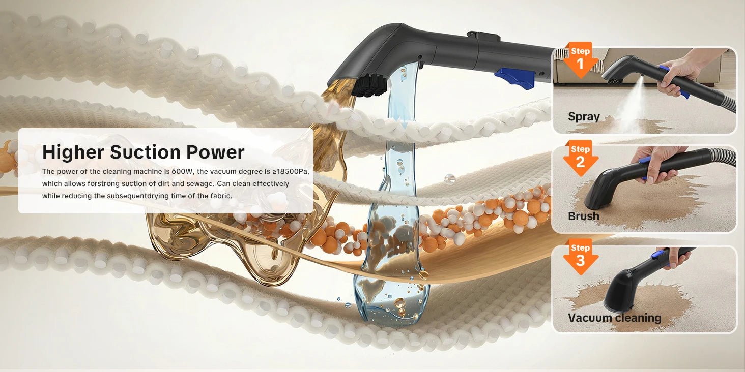- Diese Leistung deckt eine Vielzahl von Oberflächen ab, darunter Teppiche, Stoffe, Matratzen, Autositze und Polstermöbel.