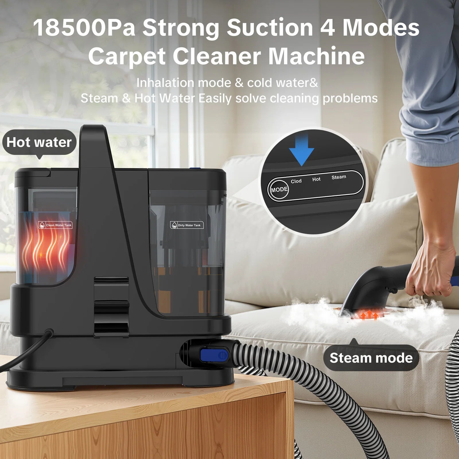 - Vier Reinigungsmodi decken unterschiedliche Szenarien ab: Nur-Saug-Modus, Kaltwassermodus, Warmwassermodus und Steam-Modus – für jeden Schmutz die passende Lösung.