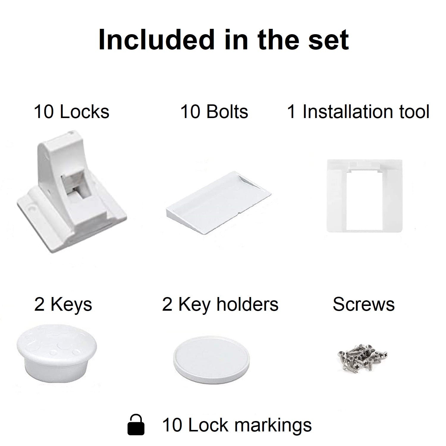 - Lieferumfang: 10x Schlösser, 10x Riegel, 1x Montagehilfe, 2x Schlüssel, 2x Schlüsselhalter, 20x Schrauben, 10x Markierungen.