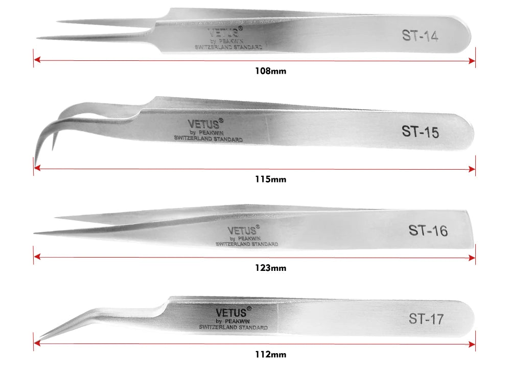 - Fein geschliffene Spitzen sorgen für exaktes Greifen einzelner Wimpernsträhnen und ermöglichen saubere Fächer ohne Kleberreste.