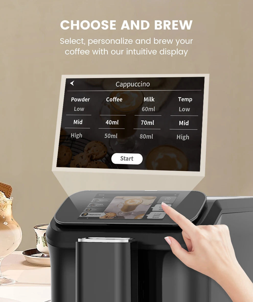 - Einfaches Touch-Bedienfeld: Intuitive Menüs ermöglichen die Auswahl von bis zu 12 Kaffeevarianten mit nur wenigen Fingertipps.