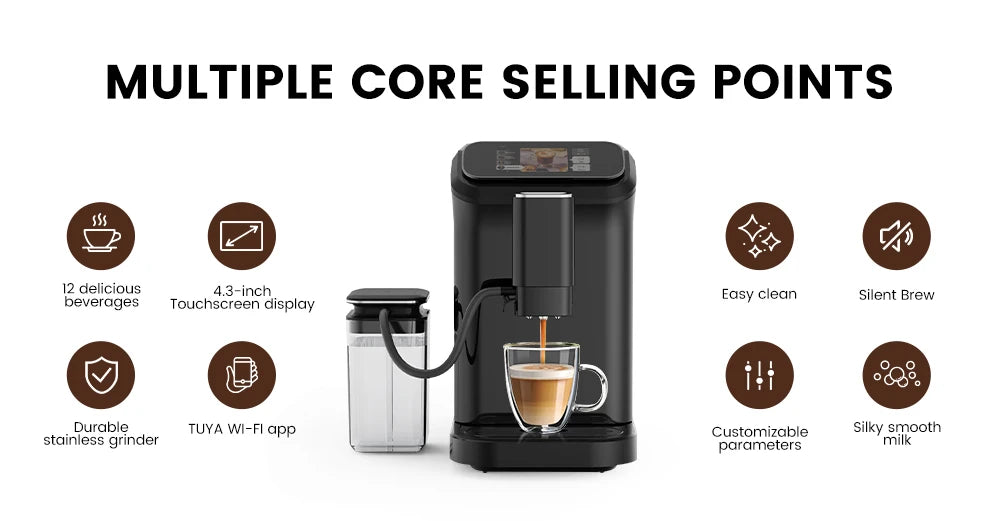 Erleben Sie perfekten Kaffee zu Hause: Die Mcilpoog WS-D5 kombiniert smarte Wi‑Fi-Steuerung, ein wasserdichtes Touch-Display und integrierten Milchaufschäumer für zehnfache Genussvariationen direkt in Ihrer Küche.