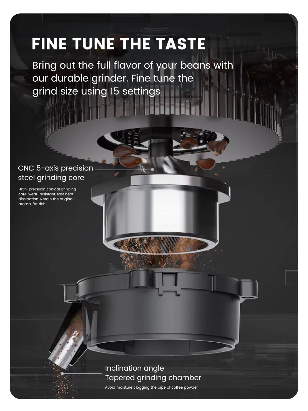 - 1,5-Liter-Wassertank: Große Kapazität reduziert häufiges Nachfüllen und ist ideal für Haushalte mit regelmäßigem Kaffeekonsum.