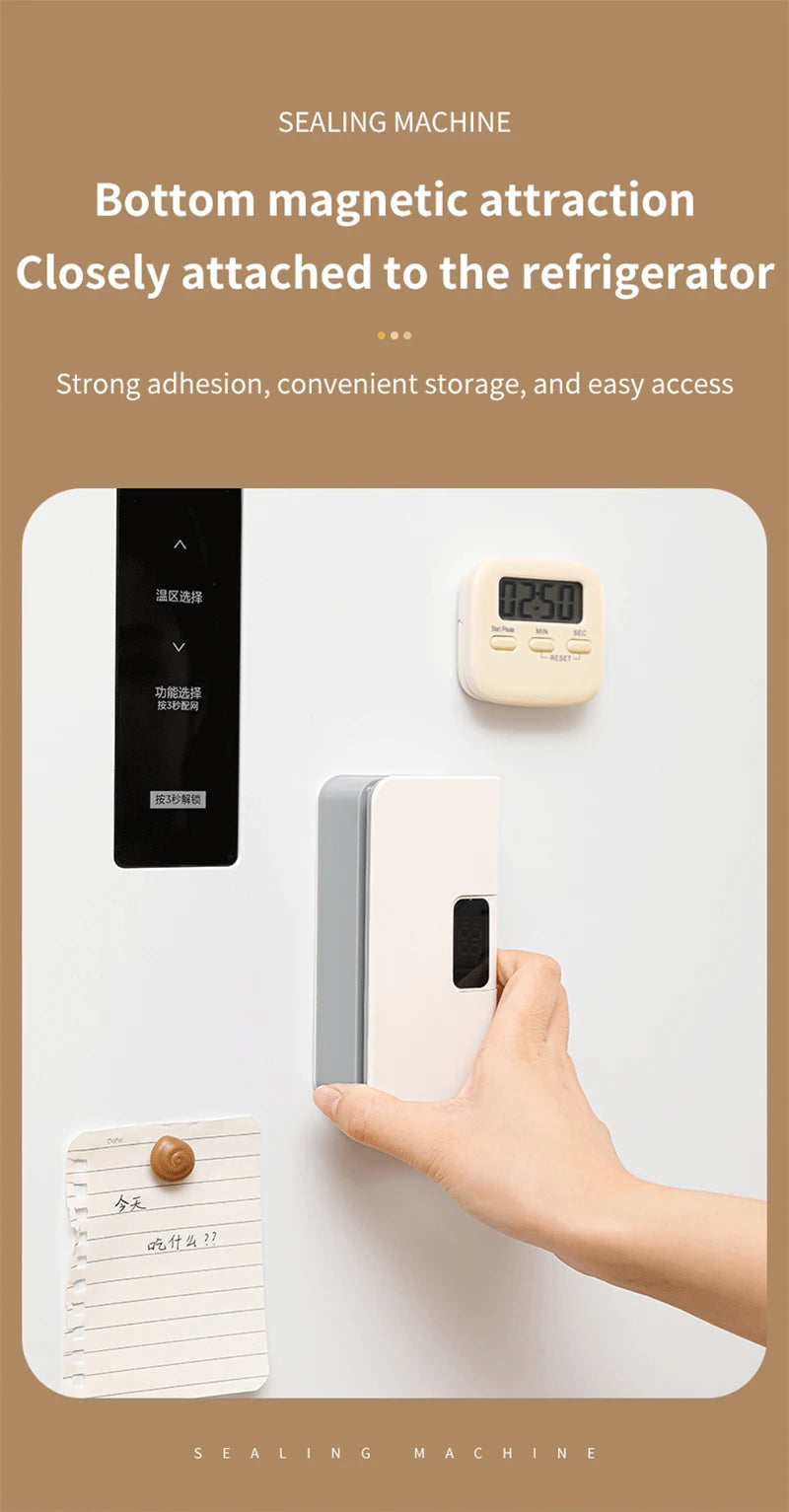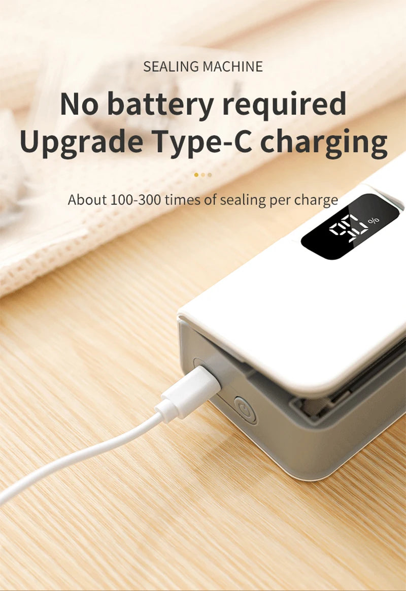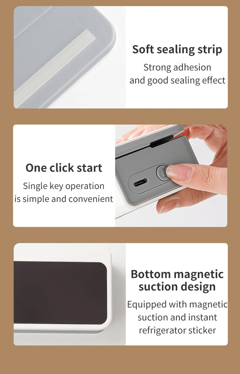 Präziser, mobiler und energiesparender Versiegeler, der Lebensmittel länger frisch hält und Verpackungen zuverlässig verschließt. Dieses handliche Gerät kombiniert einfache Bedienung mit praktischer USB-Aufladung und eignet sich ideal für Haushalt und unterwegs, um geöffnete Verpackungen schnell luftdicht zu verschließen.