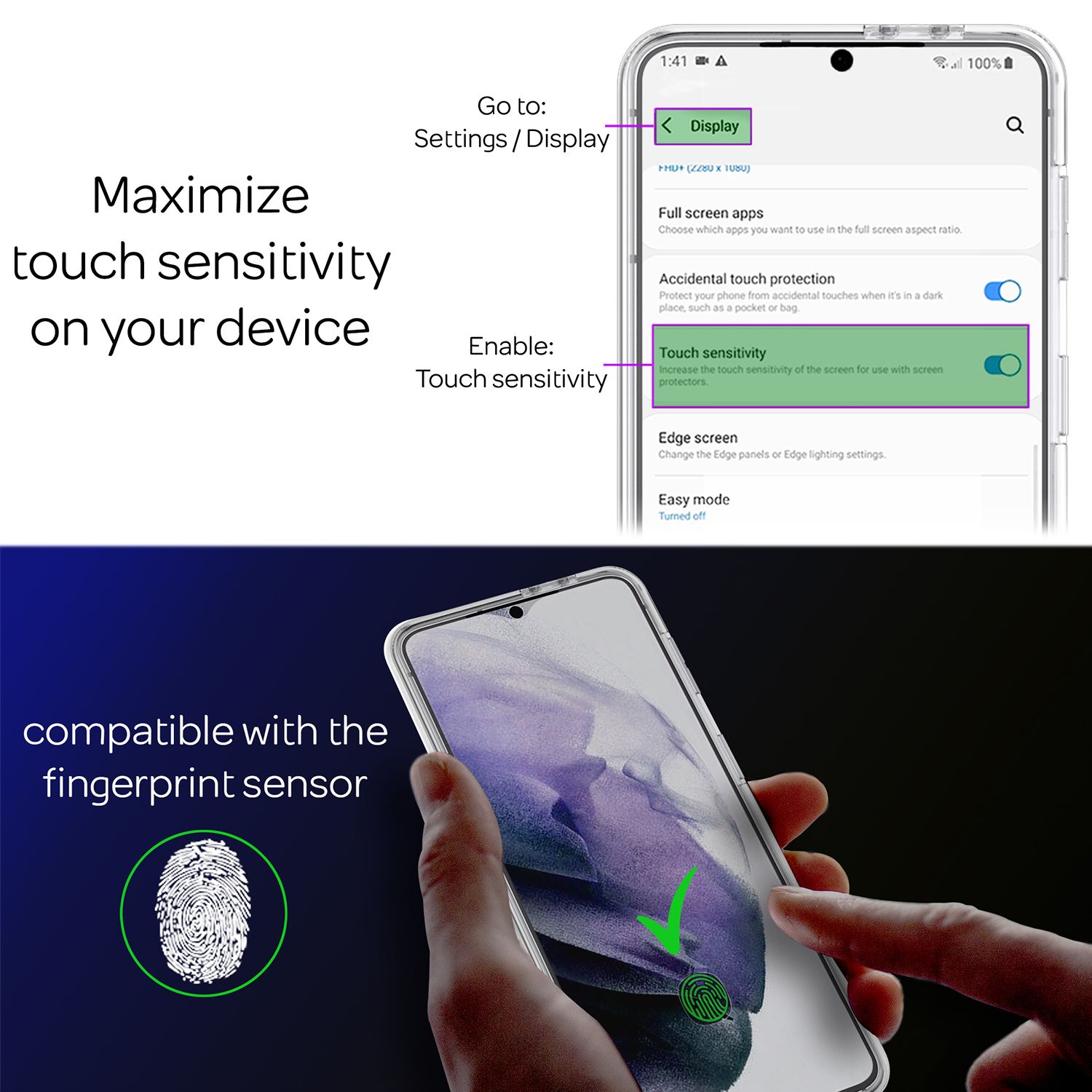 - Gehärtete Frontfolie schützt das Display vor Kratzern, ohne die Sicht oder Touch-Bedienung zu beeinträchtigen.