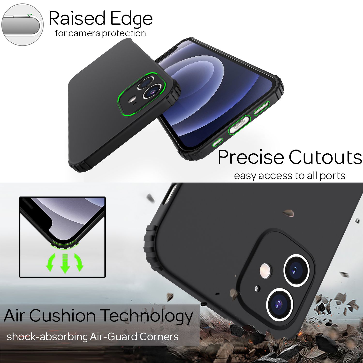 - Erhöhte Kanten an der Kameraöffnung und am Display bieten zusätzlichen Schutz, wenn das Smartphone auf flachen Oberflächen abgelegt wird.