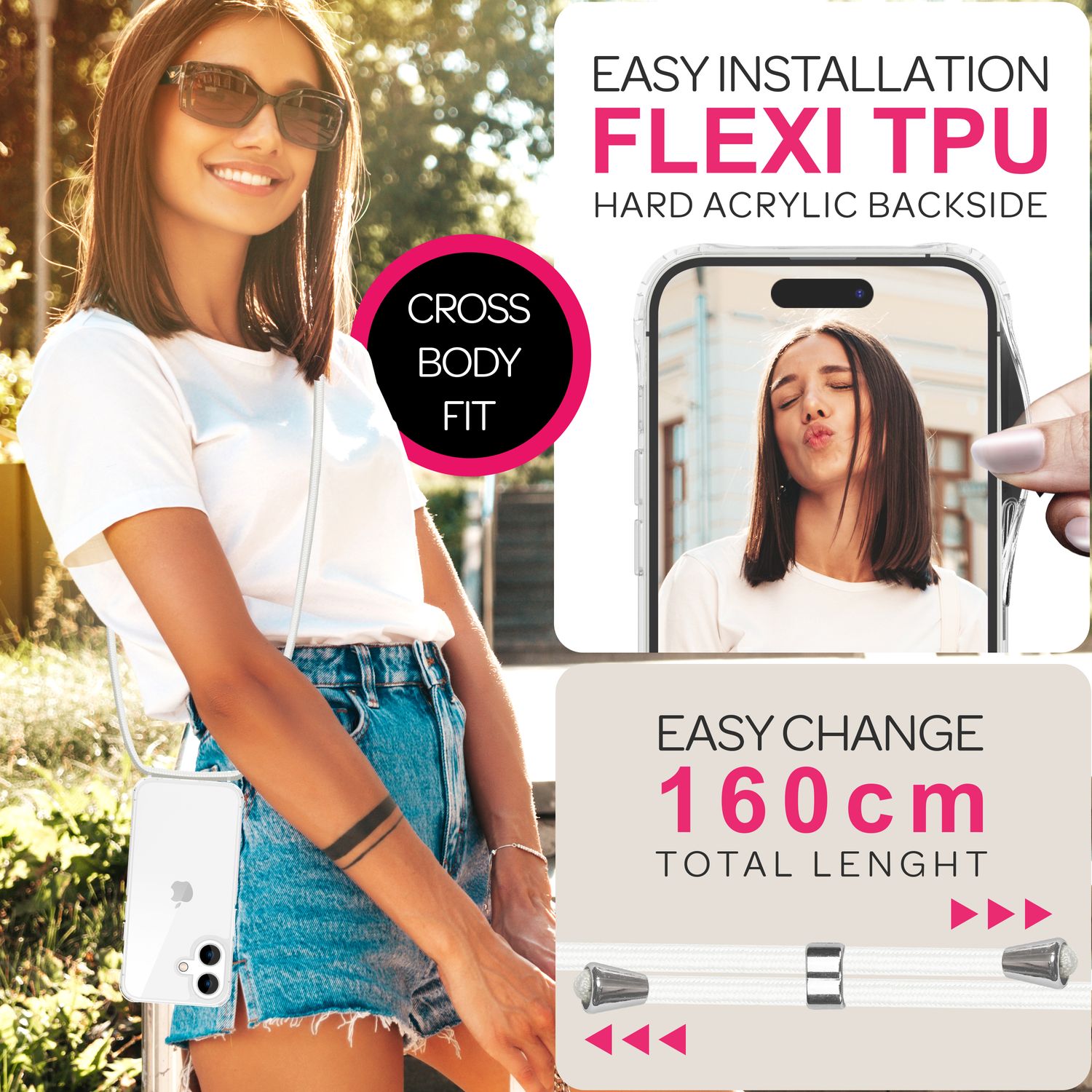 - 1 x abnehmbares, 160 cm langes Band zum Umhängen