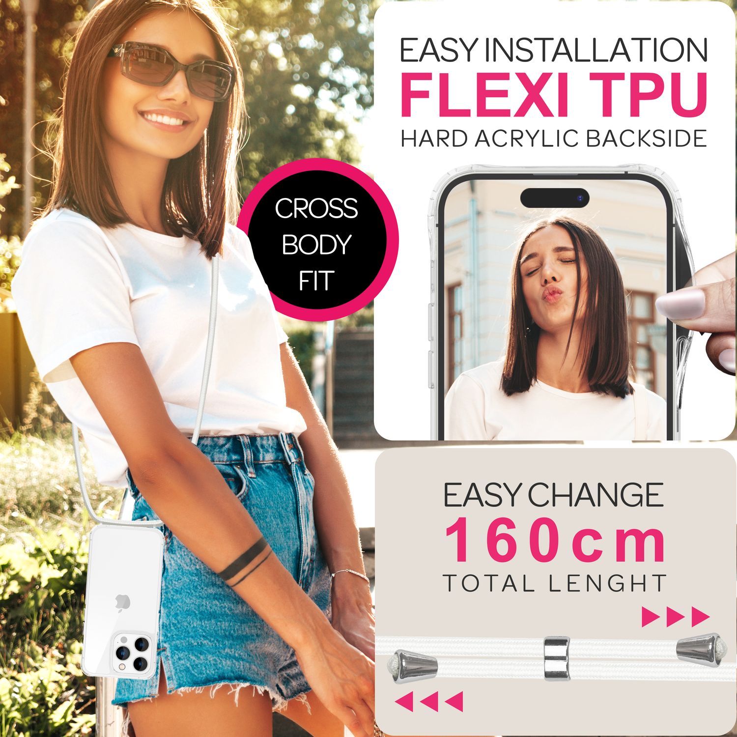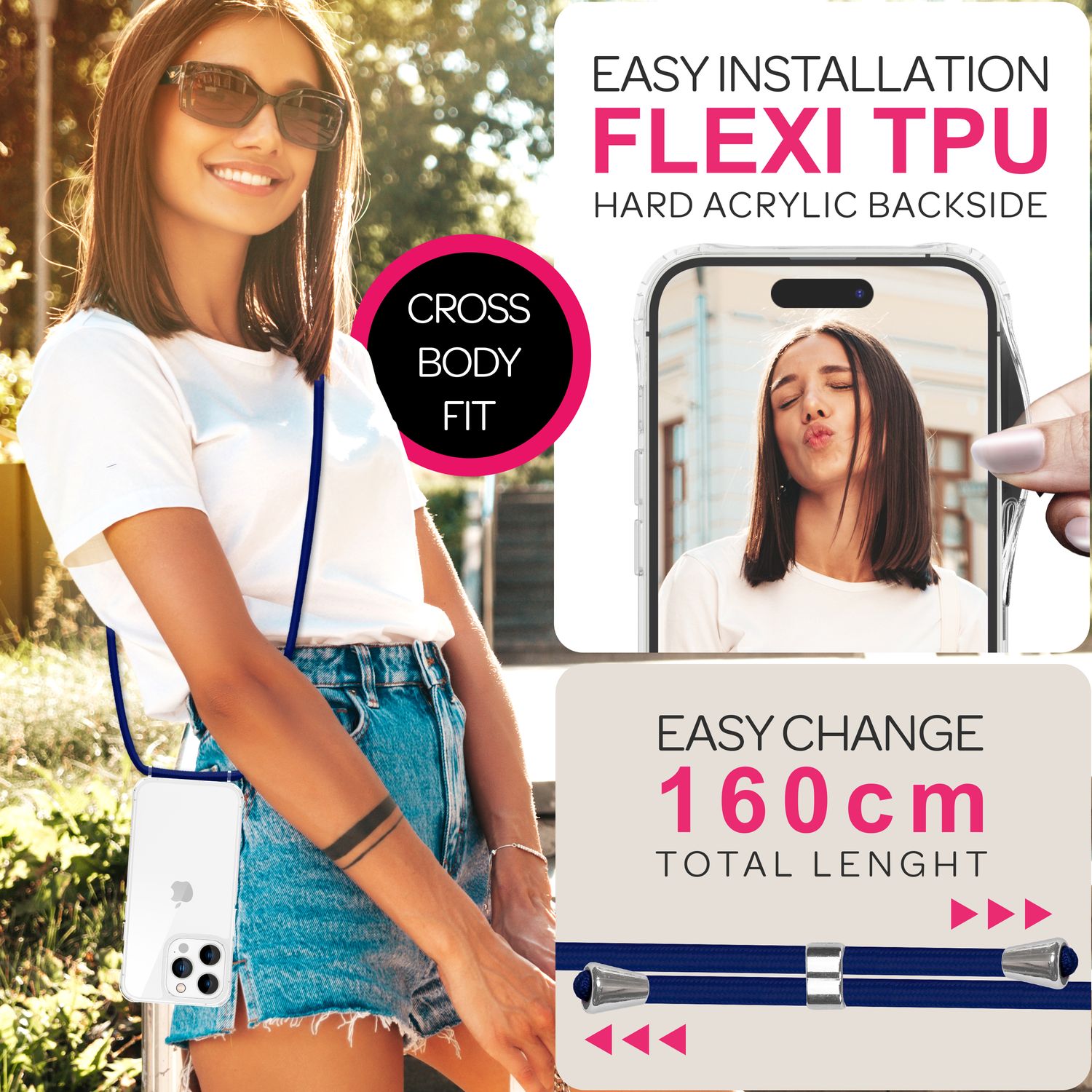 - Verstellbares 160 cm Band: Tragen Sie das Smartphone über der Schulter, crossbody oder um den Hals – flexibel an Ihre Bedürfnisse anpassbar.