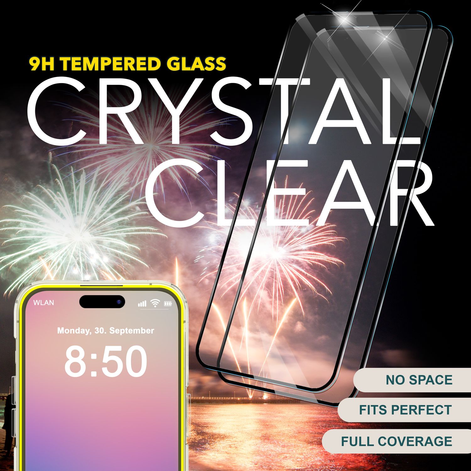 Das Set enthält zwei Full-Cover-Schutzgläser und ein komplettes Applikationsset, inklusive Reinigungstools – ideal für einen makellosen, langlebigen Displayschutz.