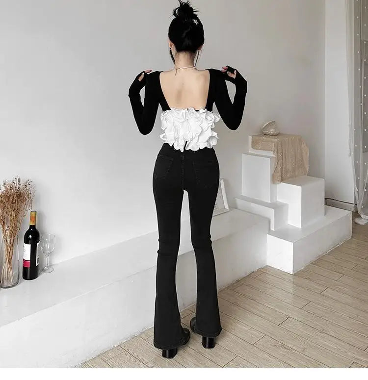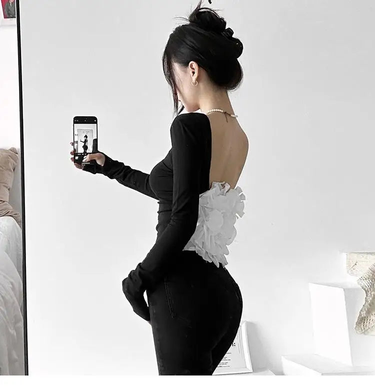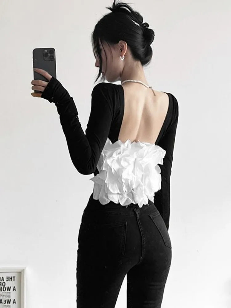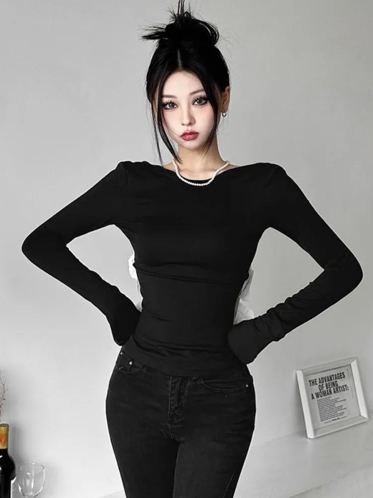 New elegant Tshirts for Women 2025 Ropa Mujer Patchwork Tops Tunic Long Sleeve Tees Backless Crop Fashion Casual Y2k T-shirt