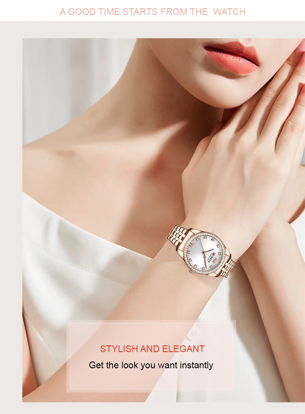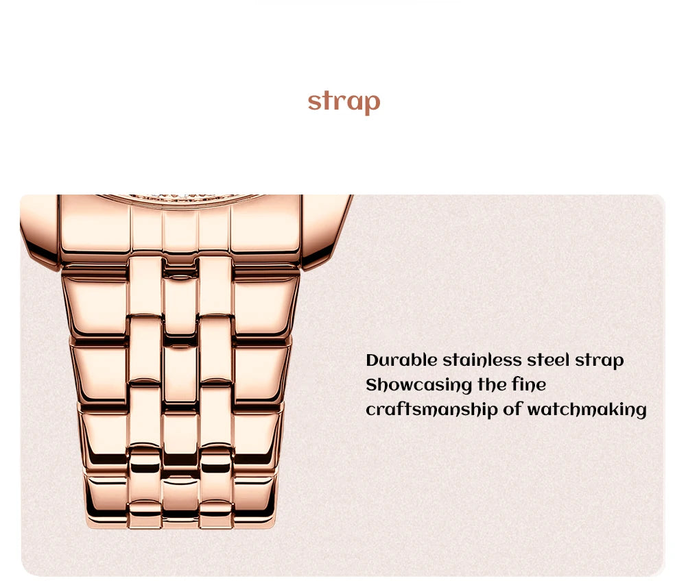 Diese elegante Damenarmbanduhr vereint hochwertiges Material, präzise Zeitmessung und ein strahlendes Design, das jeden Auftritt stilvoll abrundet.