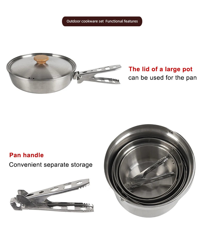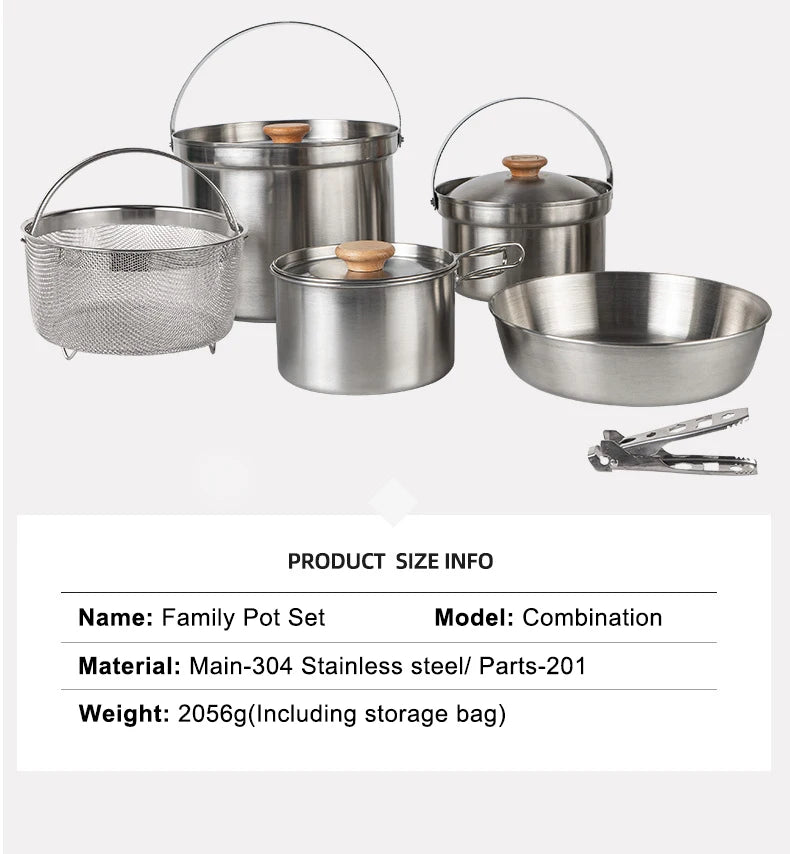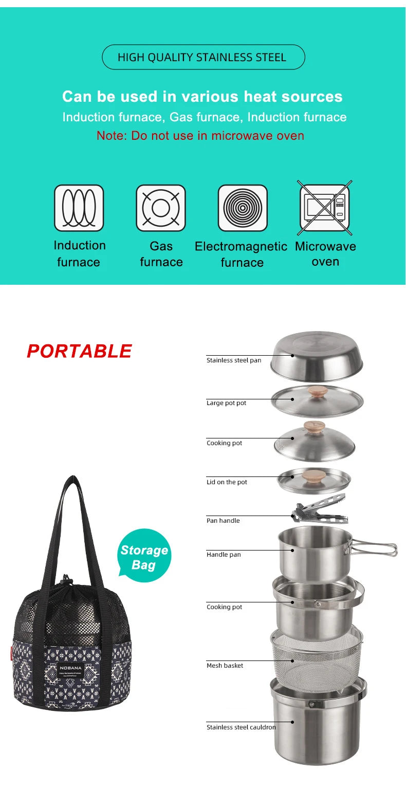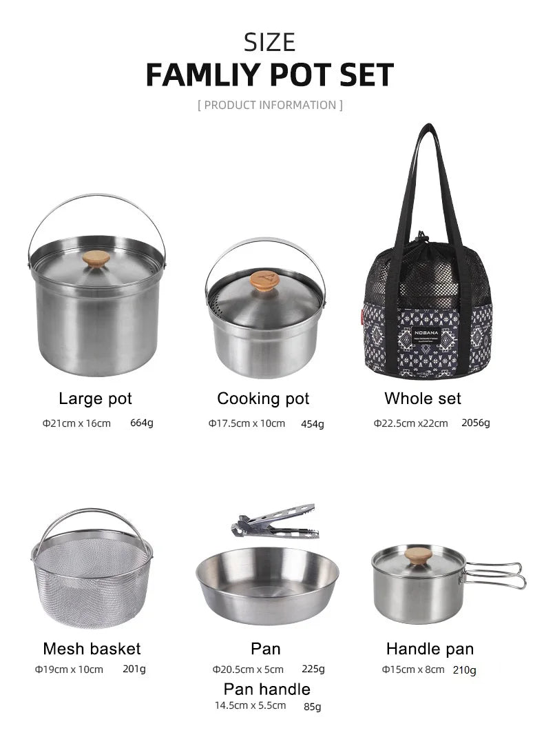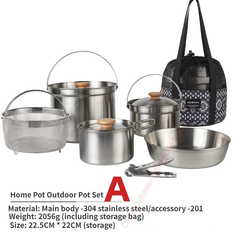 NOBANA Newest Outdoor Stainless Steel Pot Set Camping Family Pot Set 5L Portable Picnic Soup Pot Frying Steaming Household Pot