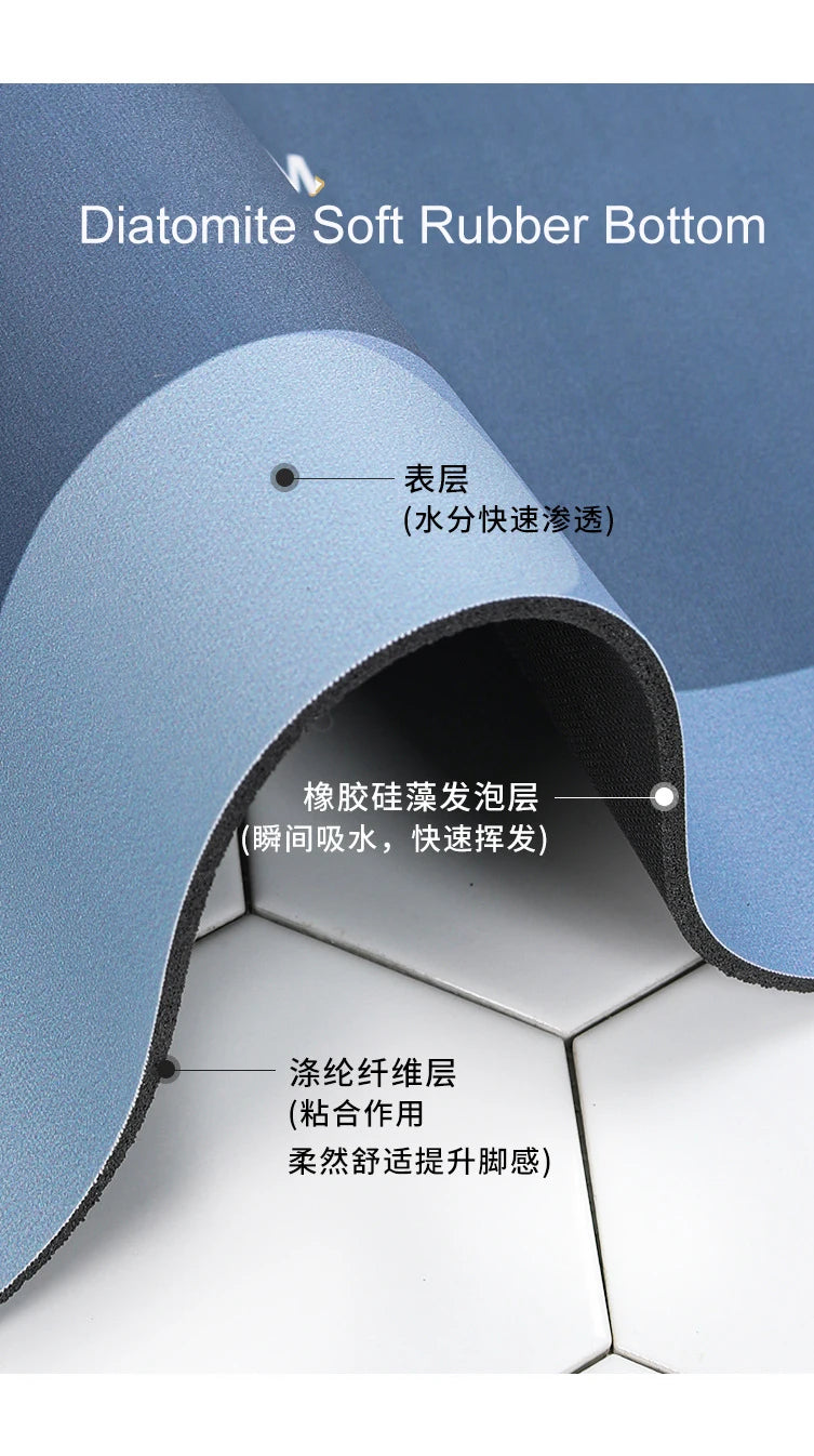 - Material: PU-Oberfläche mit saugfähiger Schicht (Diatom-Schlamm-ähnliche Eigenschaften), rutschfeste Unterseite