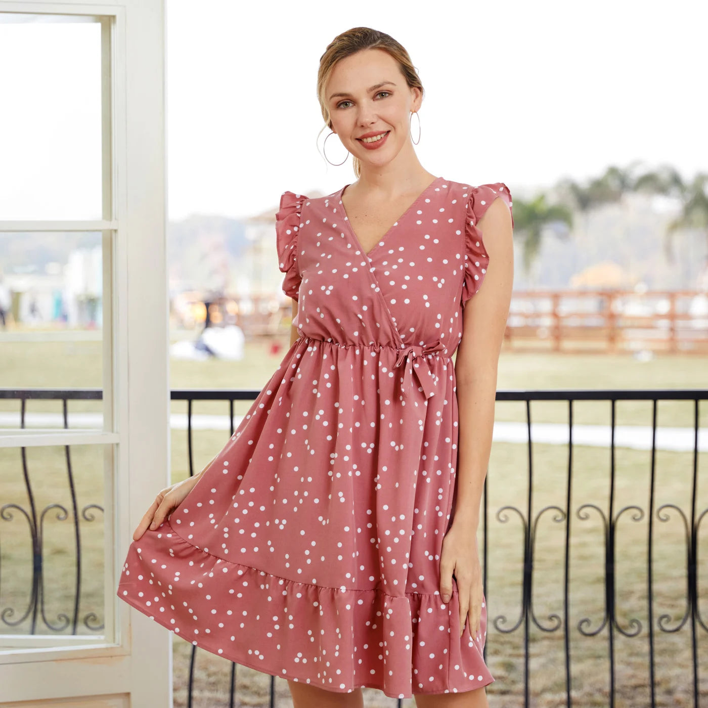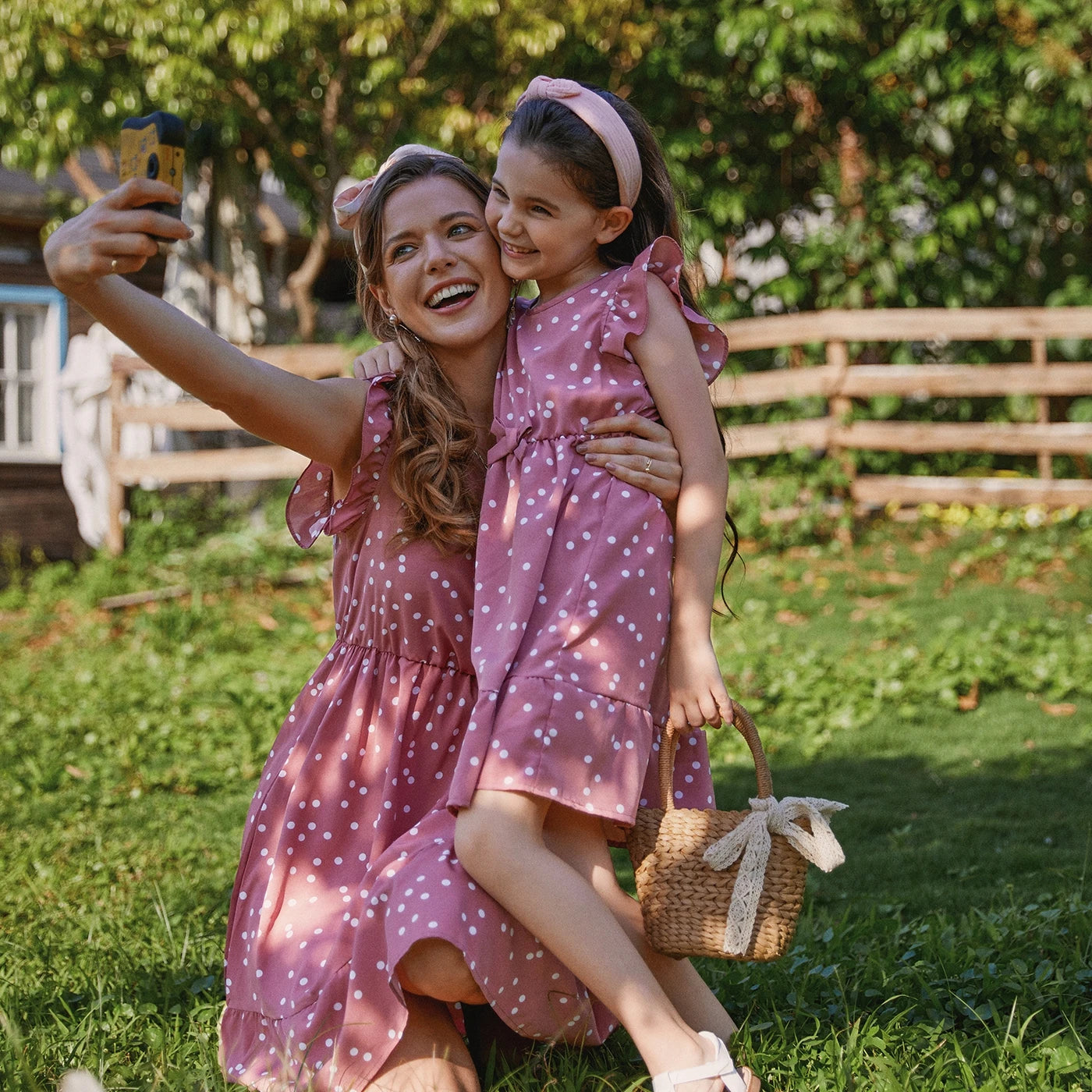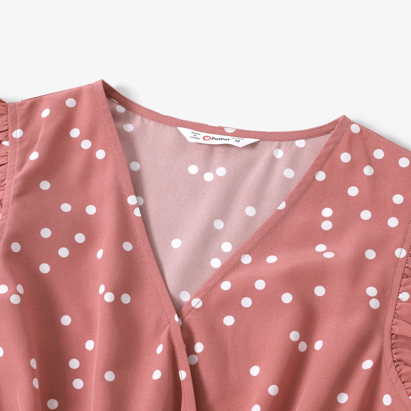 PatPat Family Matching Outfits Mother Daughter Clothes All Over Dots Pink Cross Wrap V Neck Ruffle Flutter-sleeve Dresses