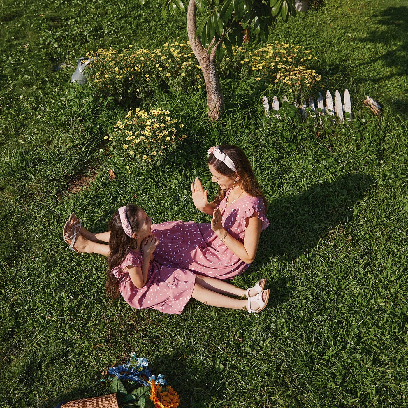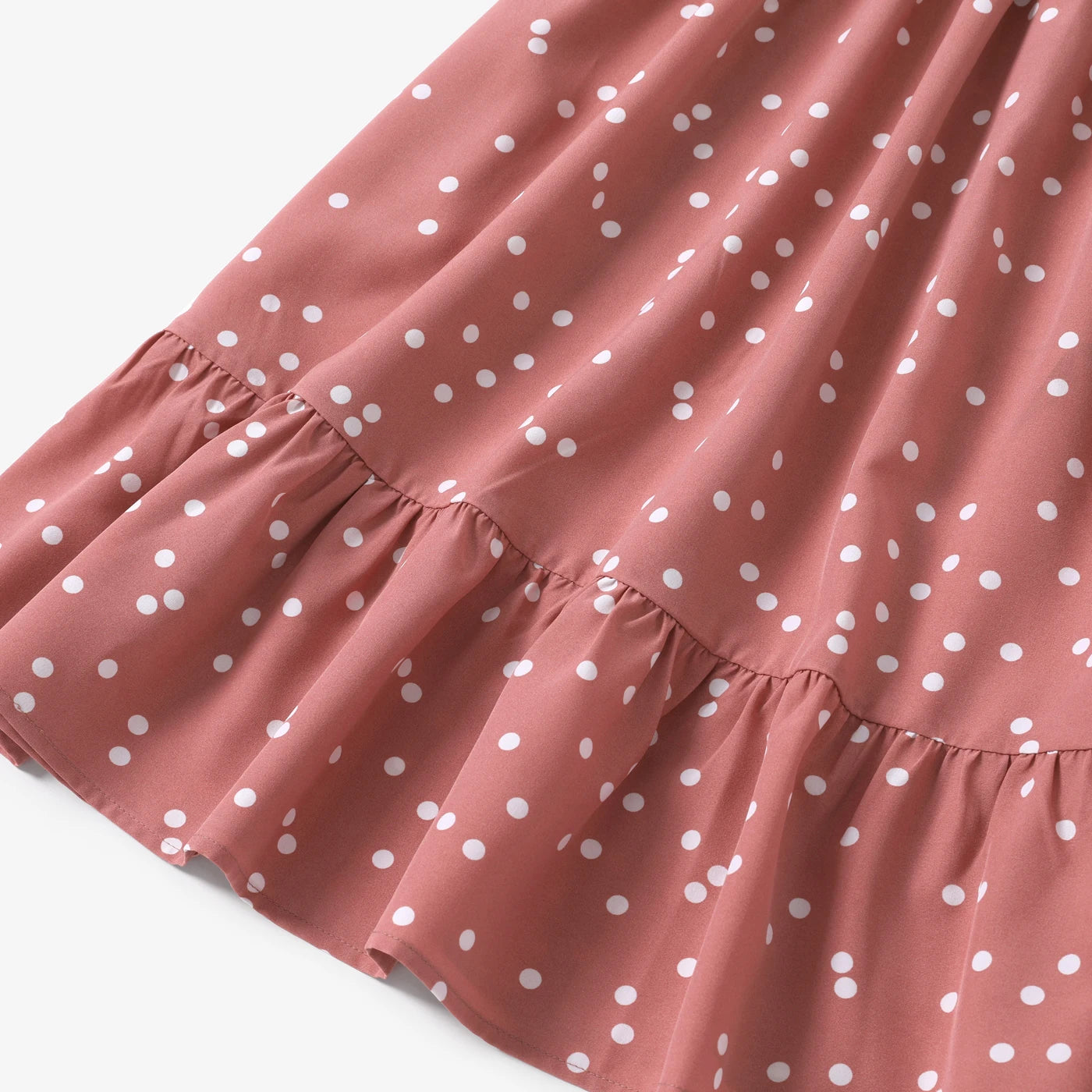 - Attraktives All-Over-Punkte-Muster in zartem Rosa, das eine freundliche und fröhliche Ausstrahlung für Mutter und Tochter schafft.